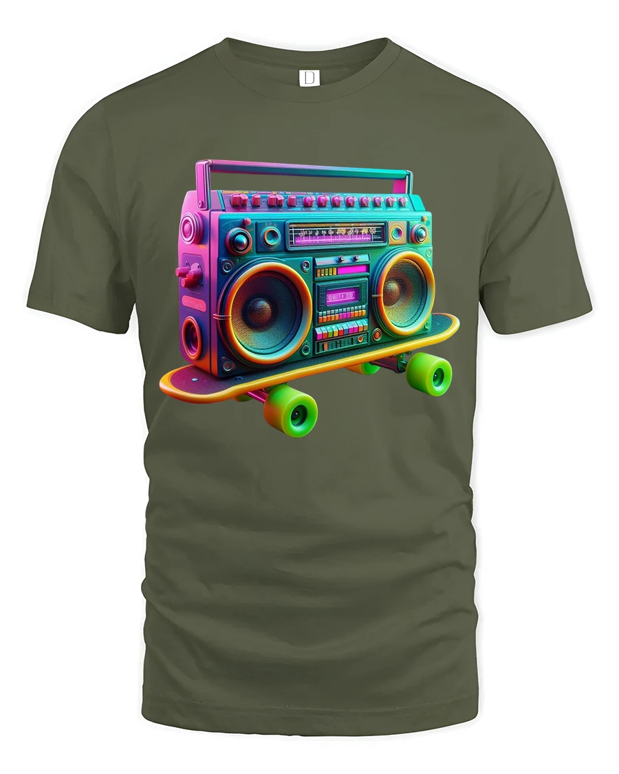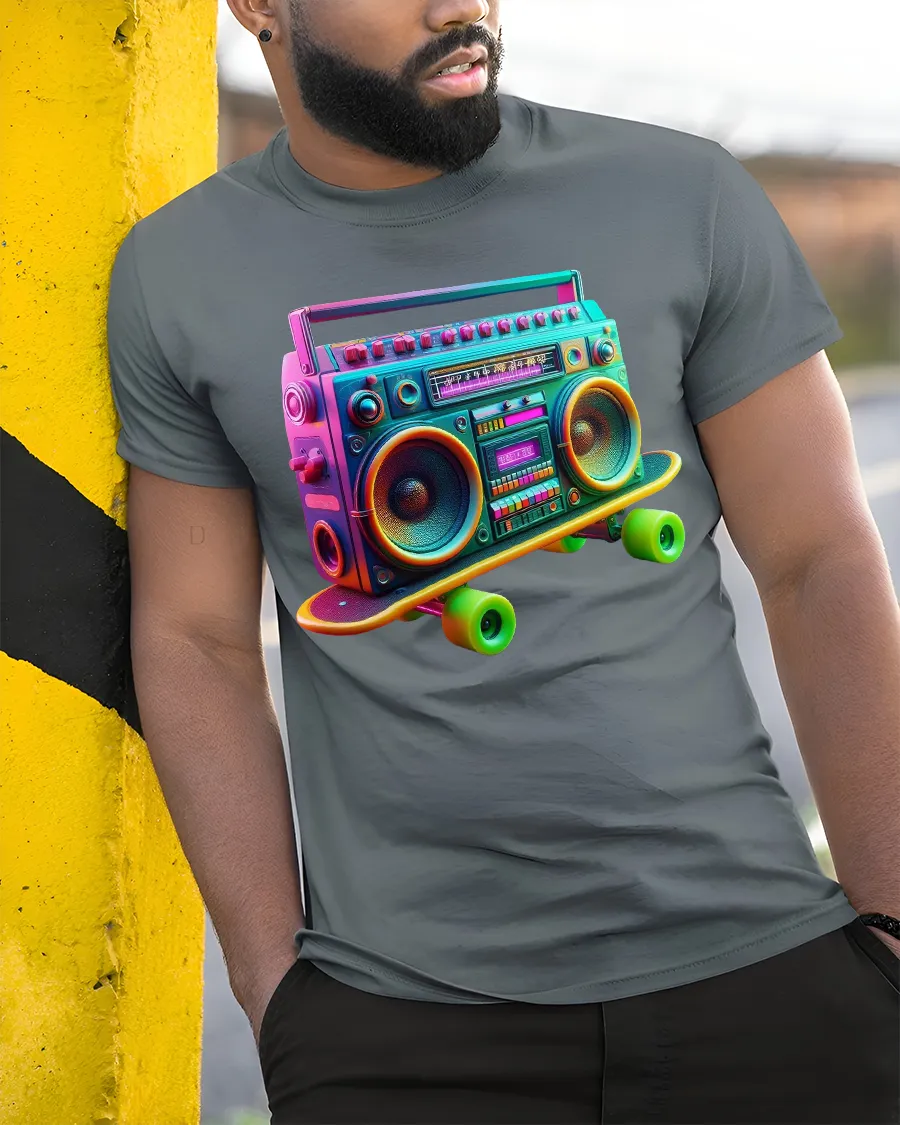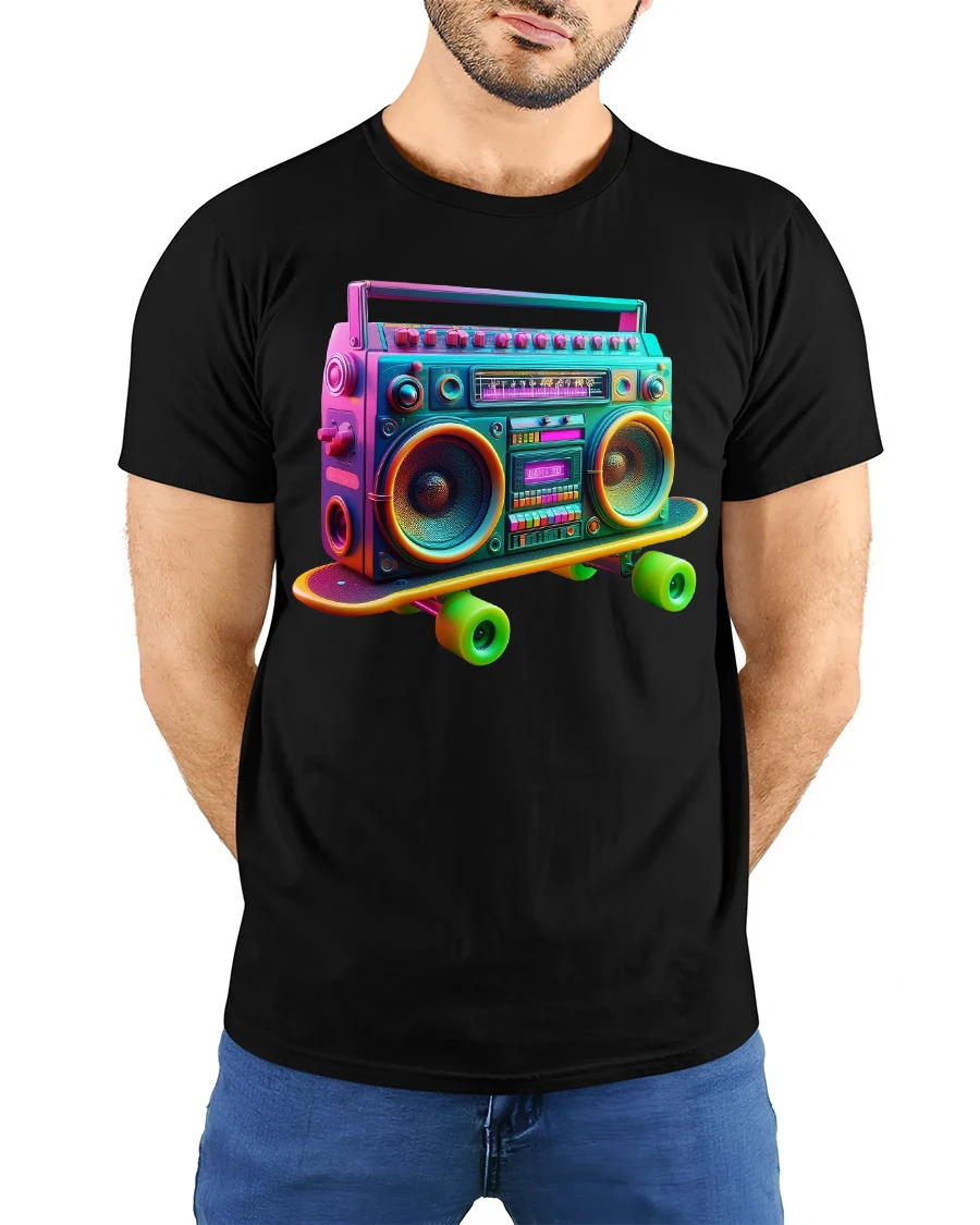 The Retro Boombox Skateboard Graphic Tee Neon Music Style blends classic music culture with bold street art creativity.