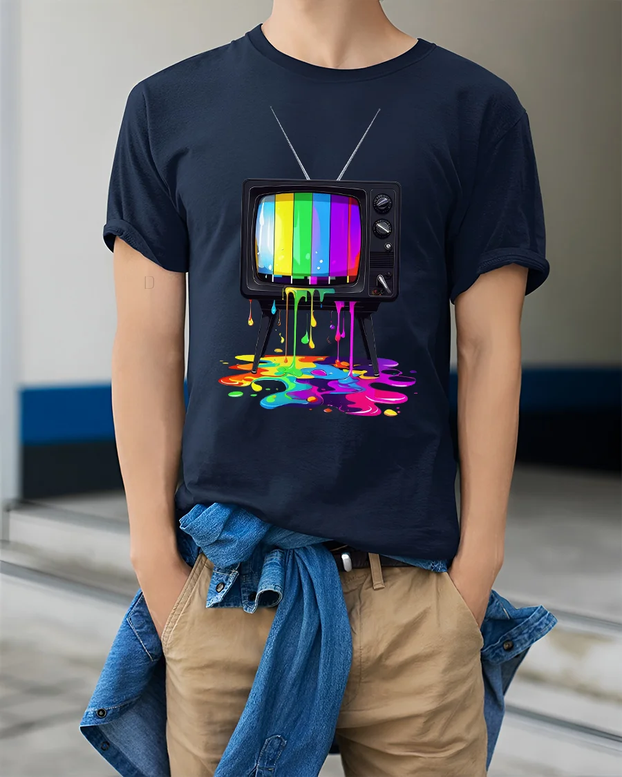 The Retro Color Melt Television Graphic T Shirt Artistic Vibe pairs effortlessly with casual outfits and creative streetwear looks.