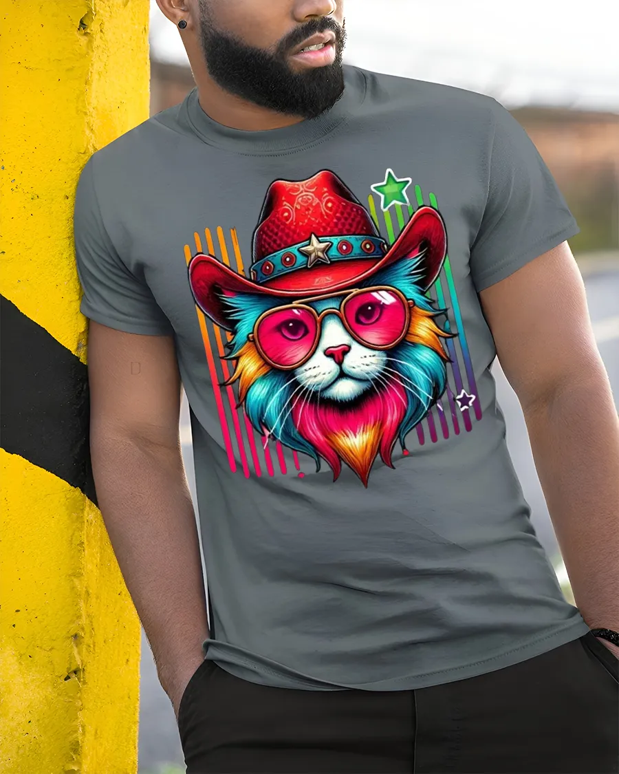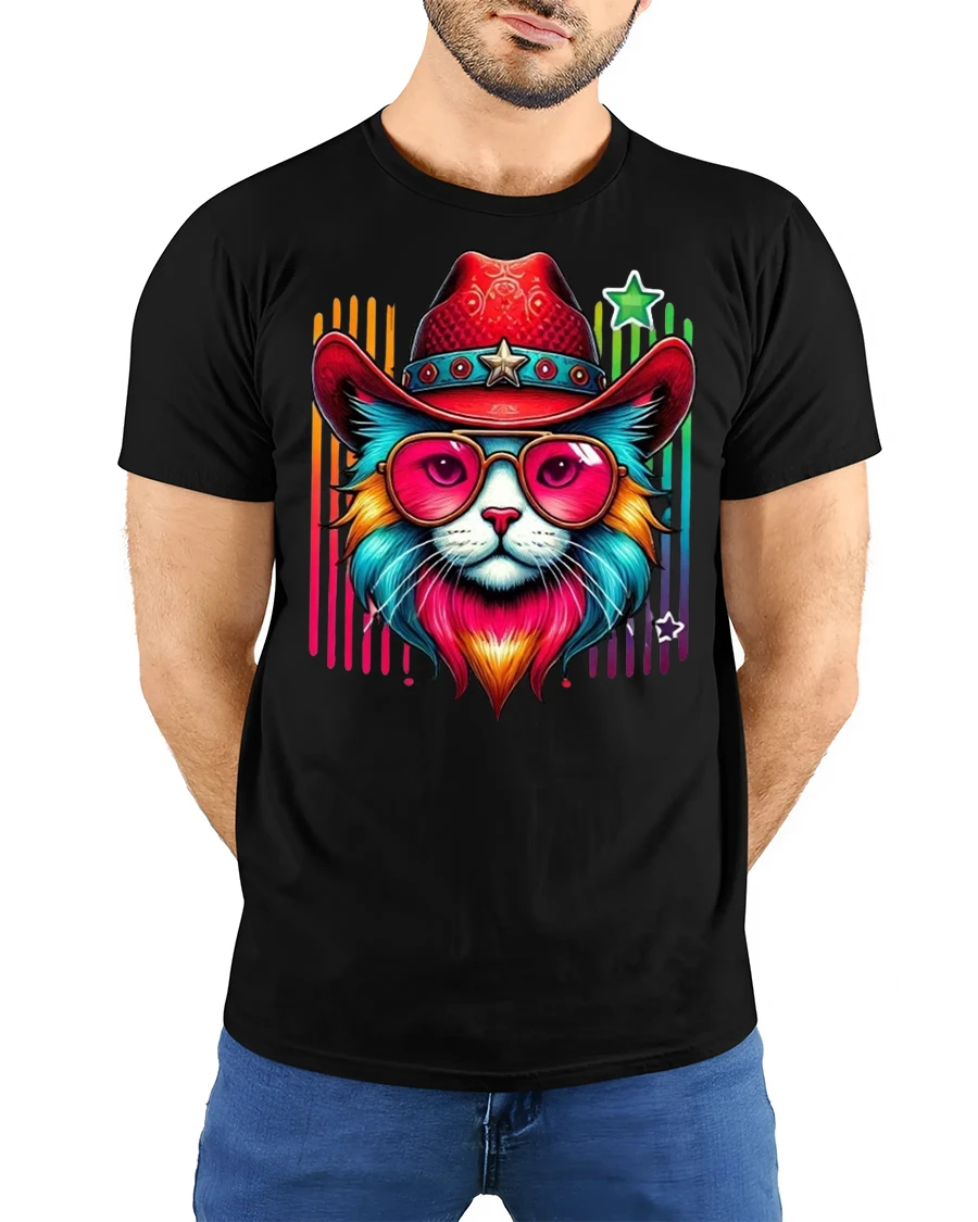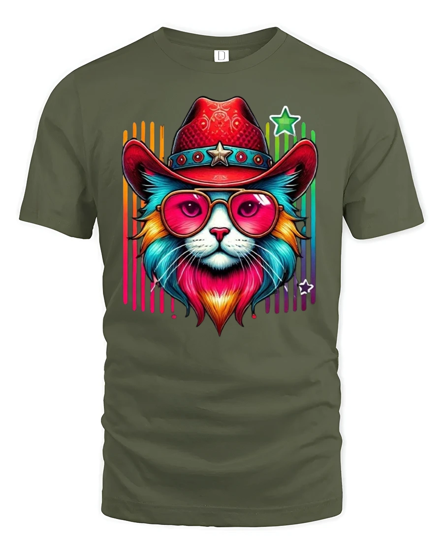 Retro Cowboy Cat Rainbow Shades Graphic Print Tee brings a mix of western flair and vibrant fun to your everyday style. Featuring a colorful cat rocking a cowboy hat, star badge, and retro sunglasses, this design is perfect for anyone who loves cats with attitude and fashion that stands out. The bold neon rainbow tones make this tee pop in any crowd.