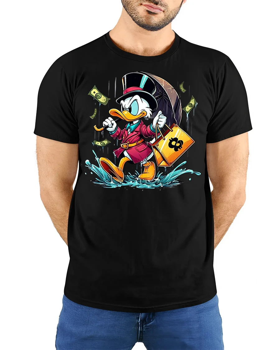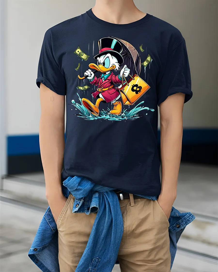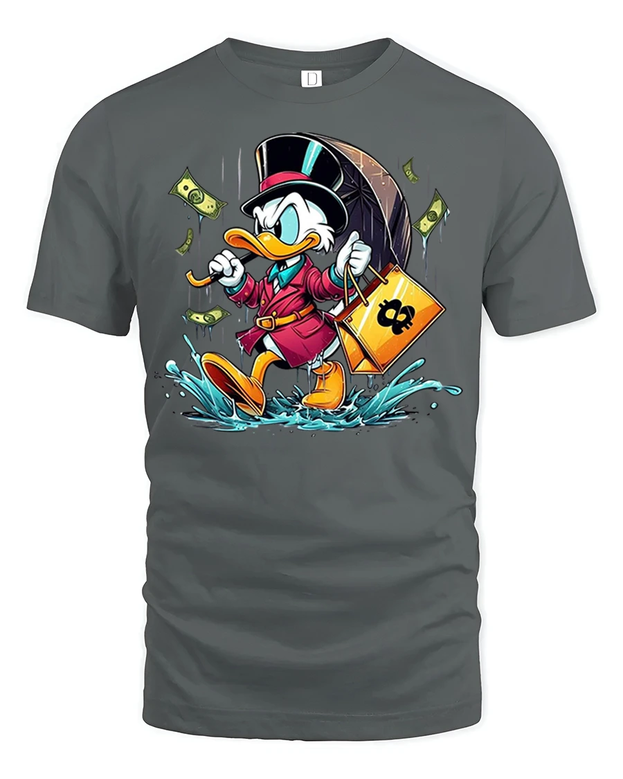 Rich Money Duck Cartoon Splash Graphic Fun Tee brings playful attitude and bold style together in one eye-catching design. Featuring a confident cartoon duck dressed in a sharp outfit, strolling through splashing water with a money bag in hand, this tshirt delivers fun, energy, and a touch of iconic wealth-themed humor. The raining bills and vibrant colors give it a standout streetwear look that’s perfect for anyone who likes expressive and lively cartoon art.