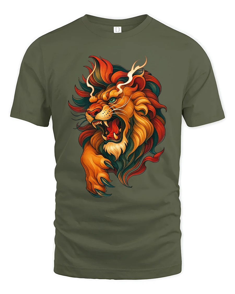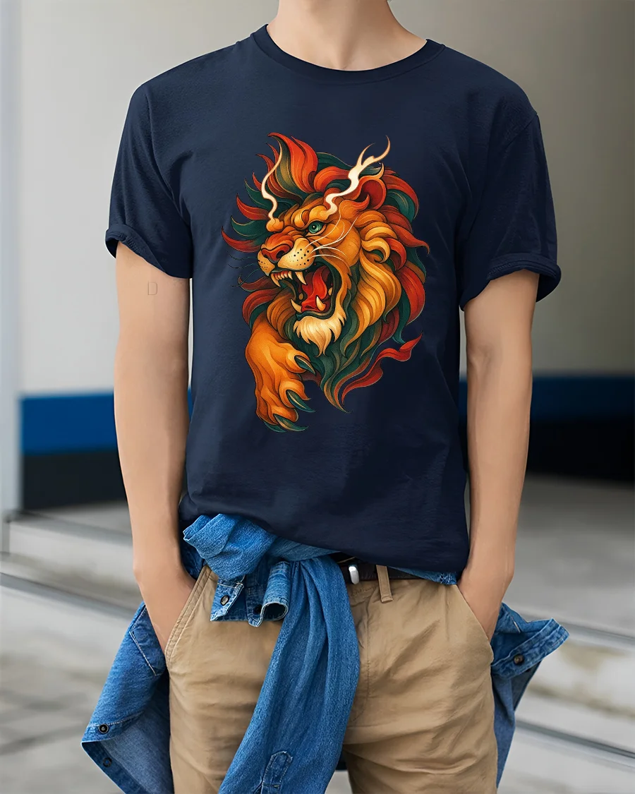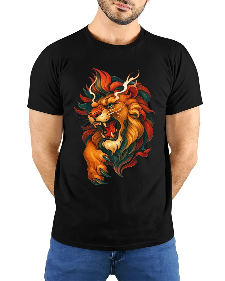 The Roaring Lion Artistic Fire Mane Illustration Graphic T Shirt showcases raw strength confidence and untamed spirit.