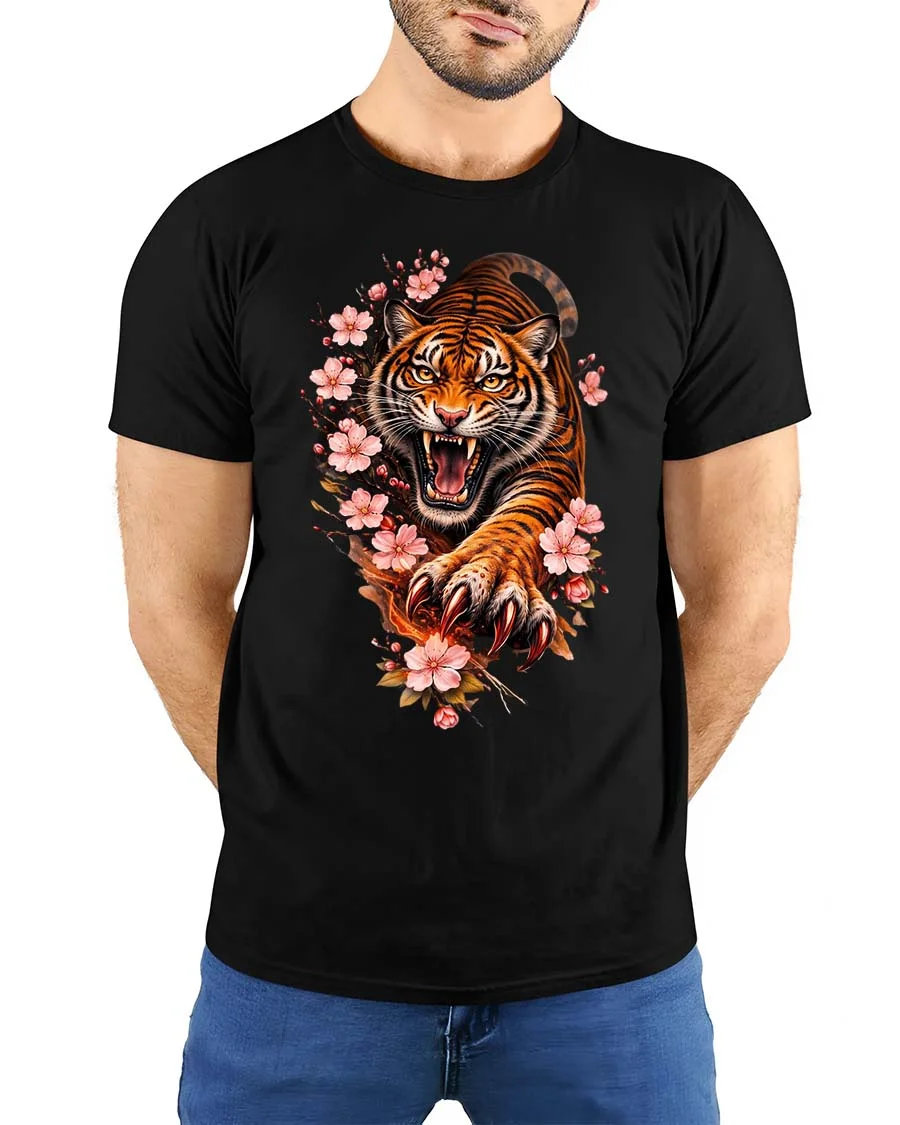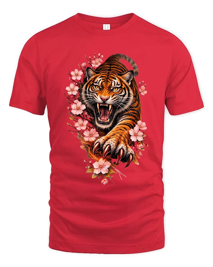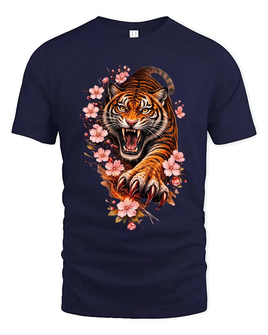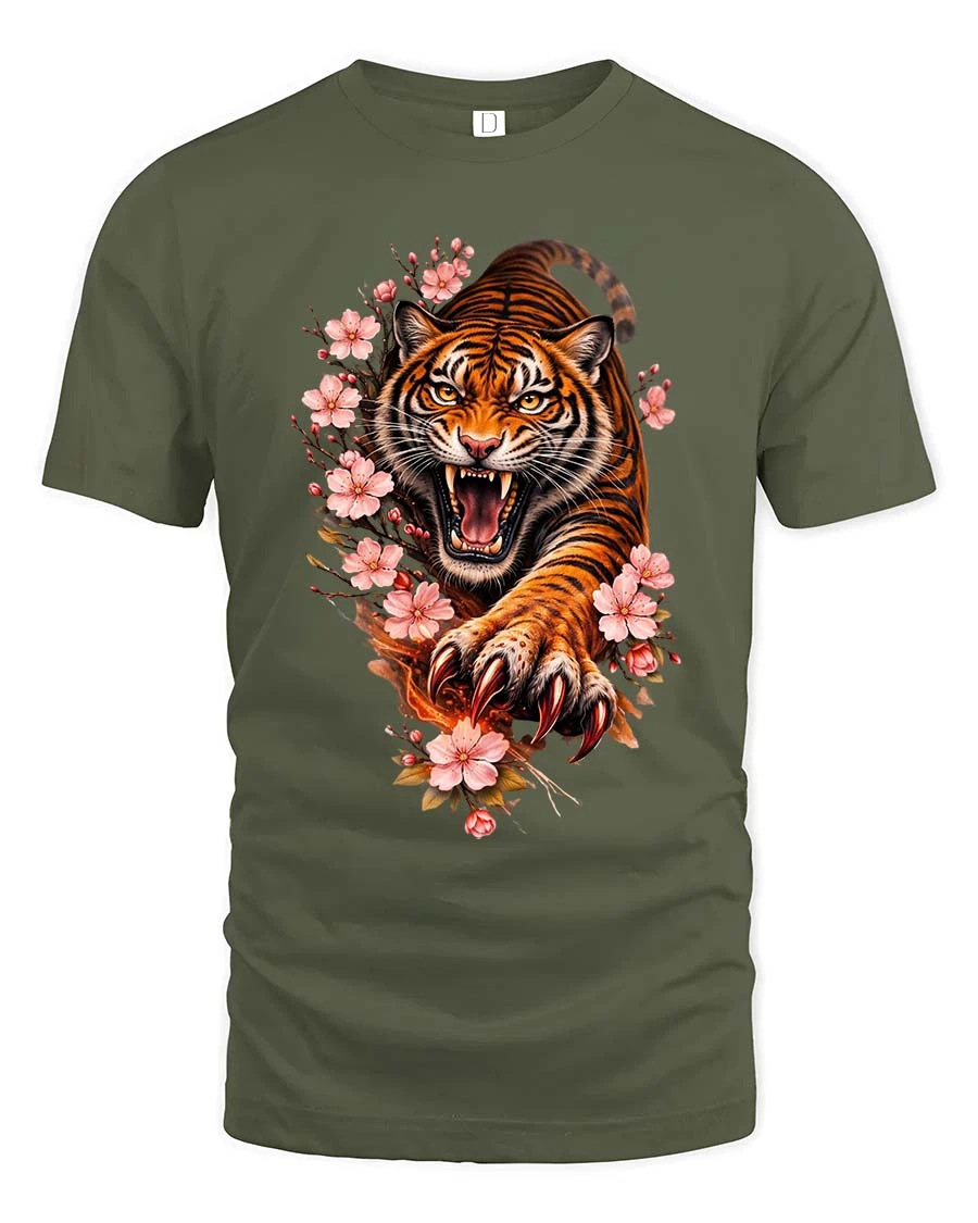 Roaring Tiger Blossom T Shirt Fierce Floral Beast Graphic combines raw power with delicate beauty in a striking design.