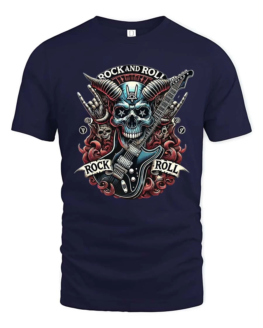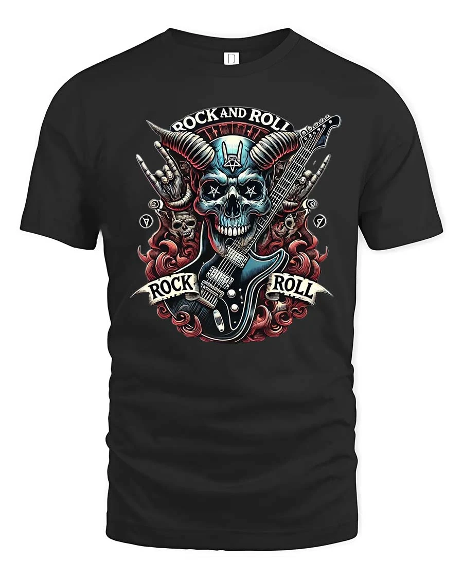 The Rock And Roll Skull Guitar Heavy Metal Graphic T Shirt Art stands out with its dynamic illustration and vintage inspired rock style.