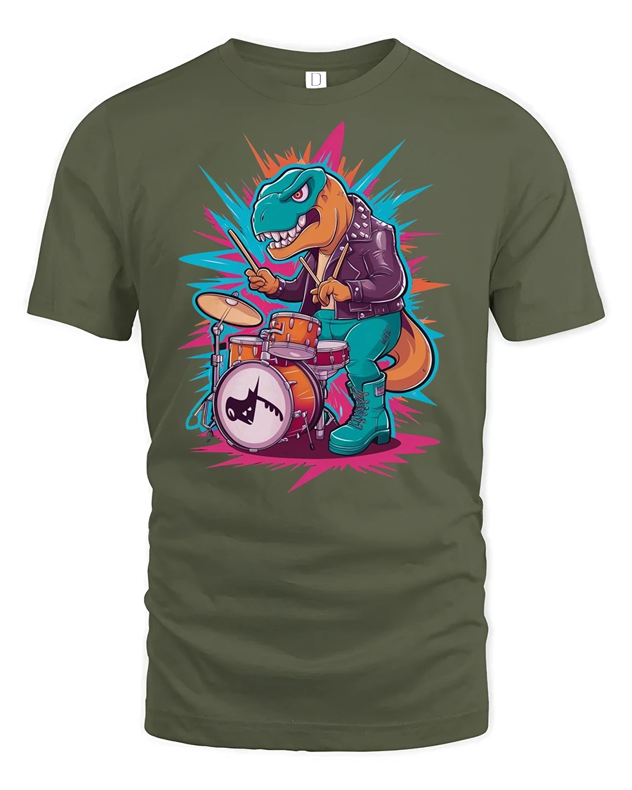 Rock Drummer Dinosaur Funny Art T-Shirt - military green t-shirt on white background
