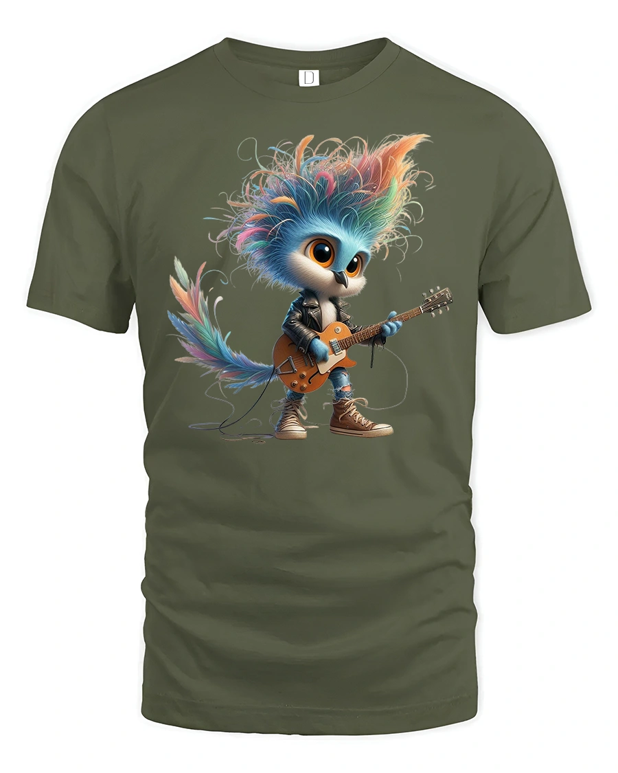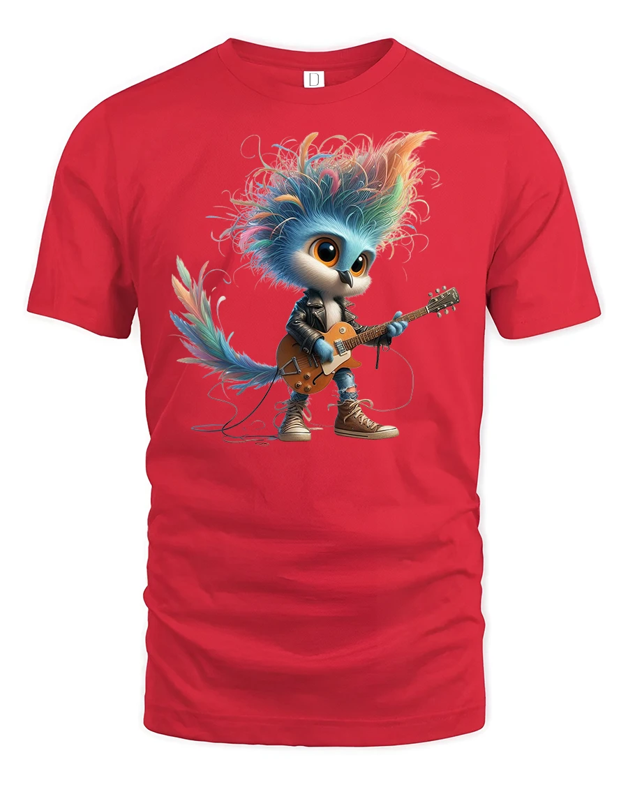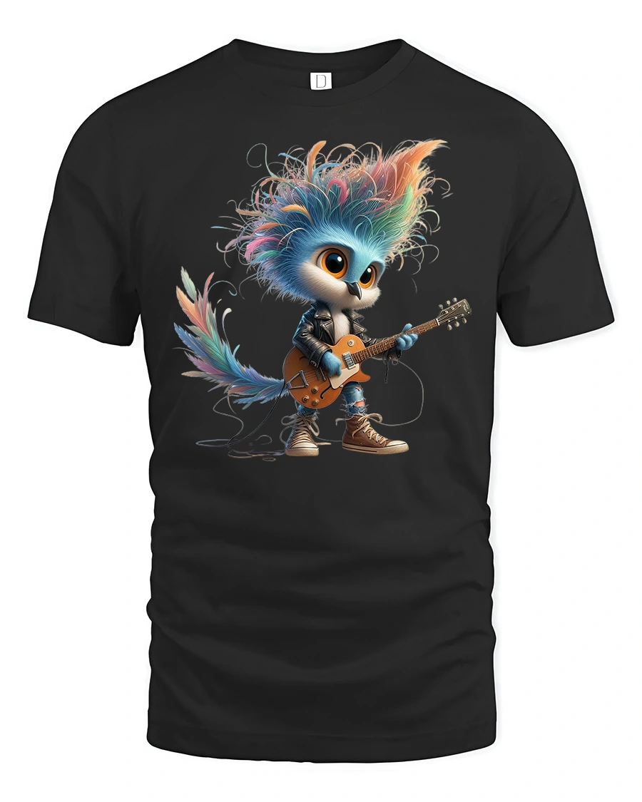 Featuring an adorable bird with wild rainbow feathers, stylish clothes, and an electric guitar, this tee perfectly blends rock star attitude with charming cartoon fun. The detailed character design, vivid colors, and lively expression make it ideal for music lovers, kids, teens, and anyone who enjoys unique and artistic apparel.