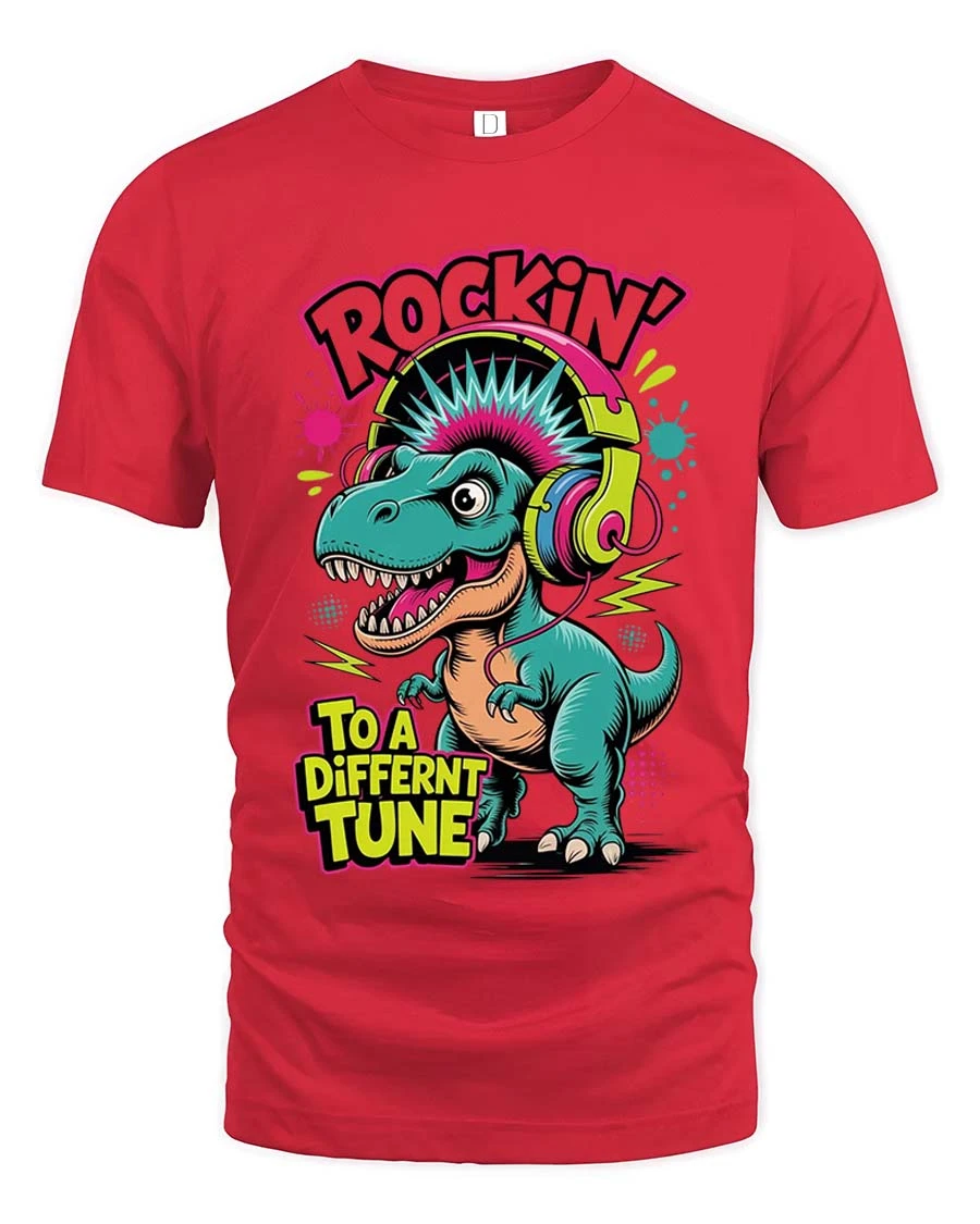Rocking Dinosaur Graphic T Shirt Funny Music Lover Cartoon Style Tee - red t-shirt on white background