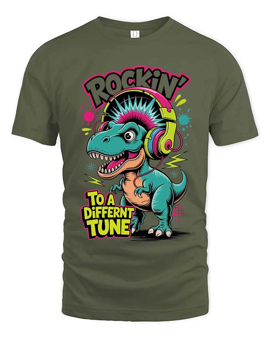 Rocking Dinosaur Graphic T Shirt Funny Music Lover Cartoon Style Tee - military green t-shirt on white background