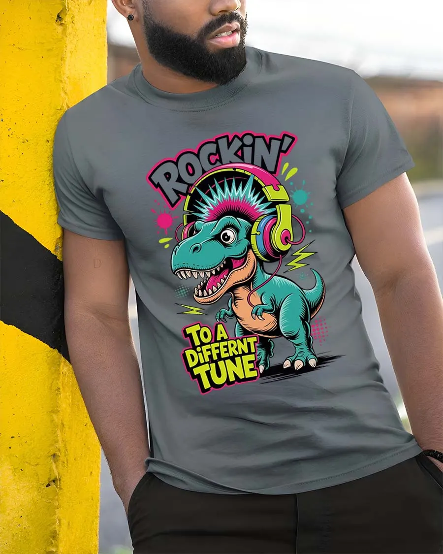 Home Youth Rocking Dinosaur Graphic T Shirt Funny Music Lover Cartoon Style Tee