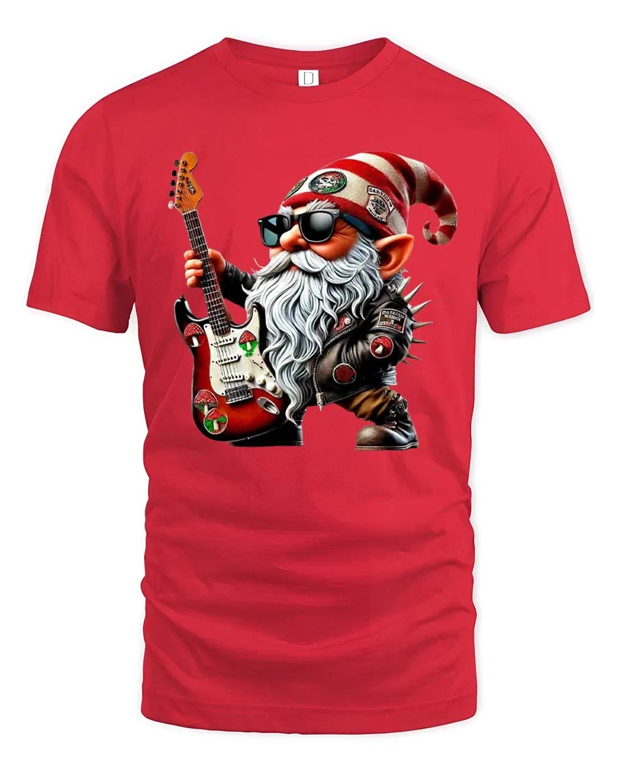 Rockstar Gnome Electric Guitar Cartoon Graphic T Shirt Cool Style - red t-shirt on white background