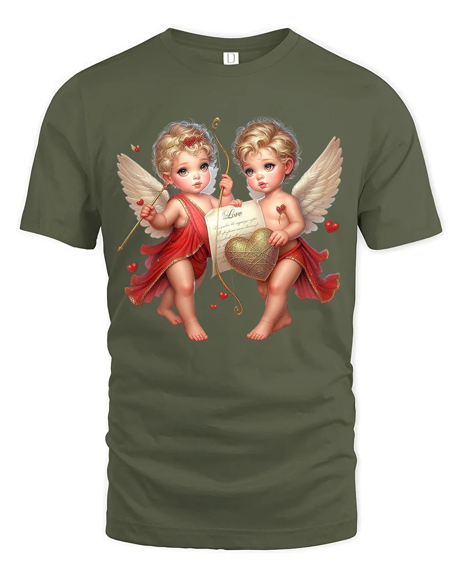 This Romantic Cupid Twins Love Heart Vintage Angel Art Tee captures the timeless charm of classic cherub-style artwork with soft details and glowing colors. Featuring two adorable cupid angels holding a golden heart and a beautifully written love scroll, this design radiates warmth and romance. The delicate wings, bright expressions, and floating hearts bring a dreamy, vintage-inspired aesthetic that stands out instantly.