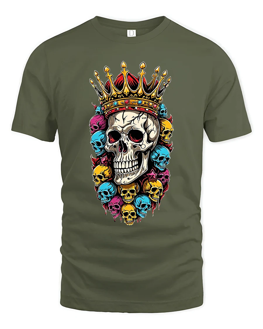 Royal Crown Skull Art Tee With Bold Colorful Rebel Style - military green t-shirt on white background
