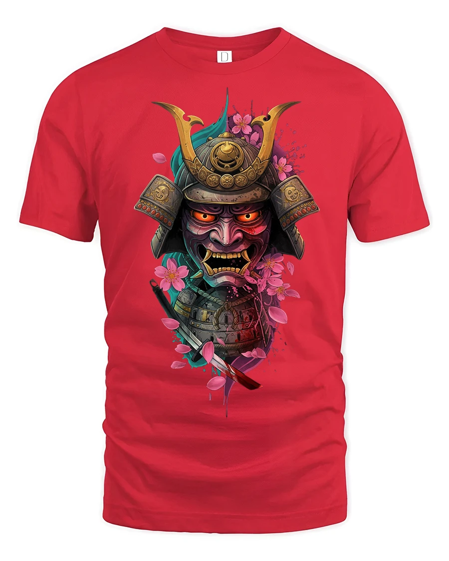 Samurai Mask Warrior Art Graphic Tee With Cherry Blossom Style - red t-shirt on white background