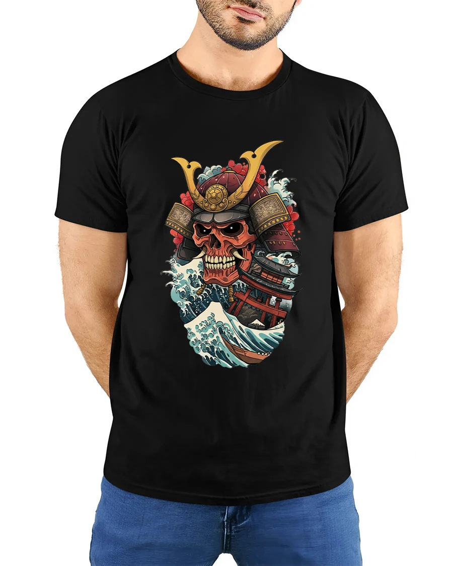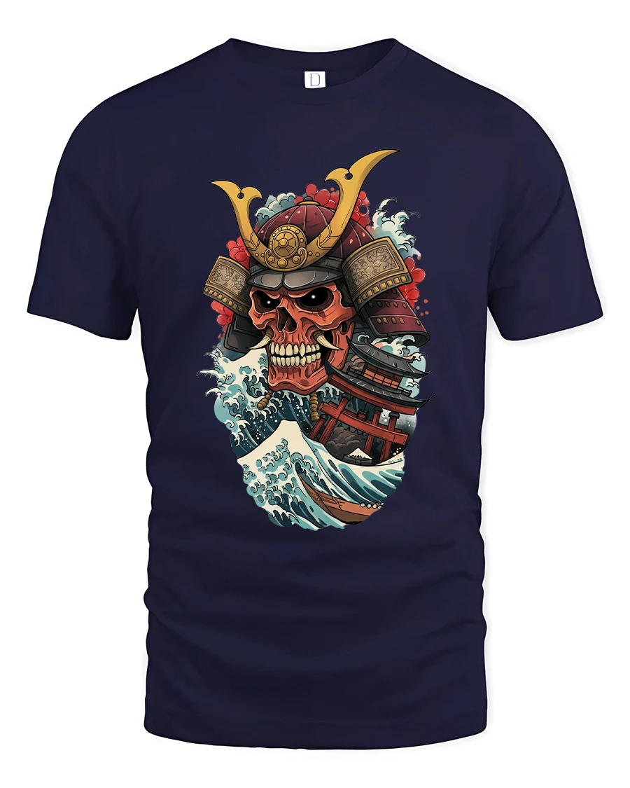 This samurai skull ocean wave warrior art graphic tshirt features a striking skull wearing traditional samurai armor surrounded by crashing waves and dramatic motion.