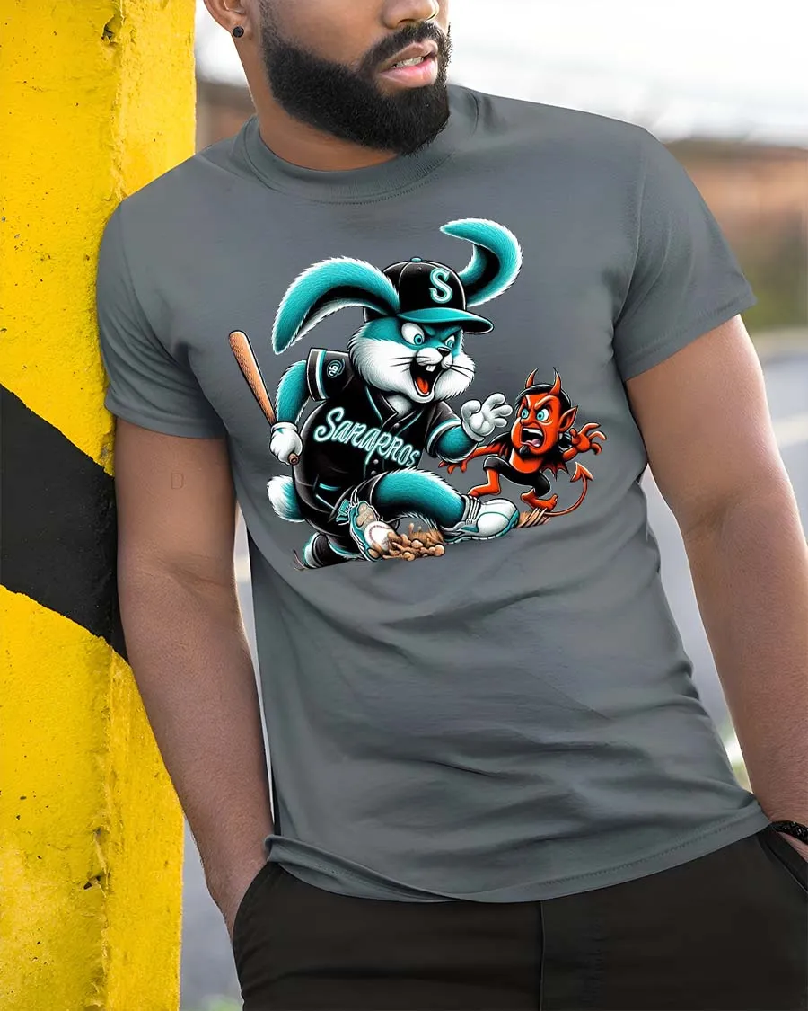 This graphic tee features a fierce cartoon bunny baseball player facing off against a mischievous little devil character, creating a fun rivalry scene full of energy and attitude.