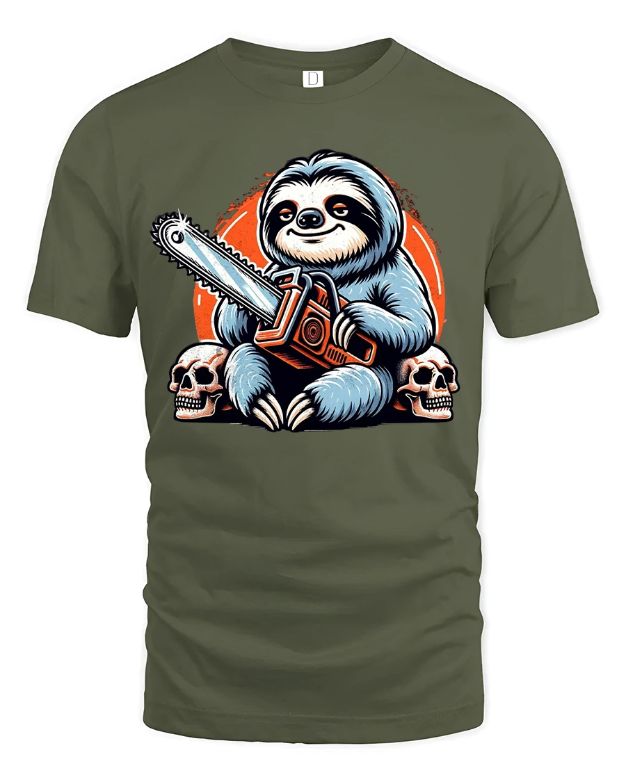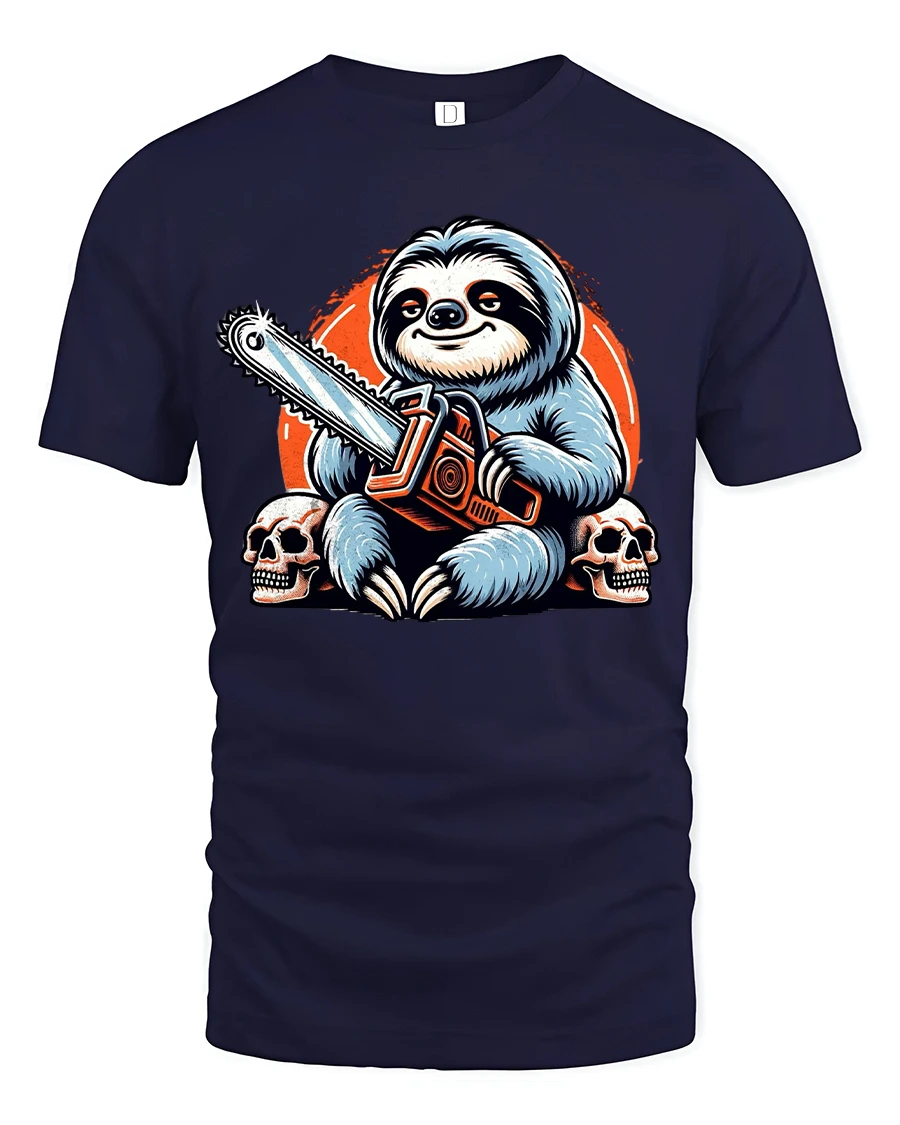 This eye catching design features a laid back sloth holding a chainsaw with a confident grin creating a perfect contrast between chill vibes and wild energy.