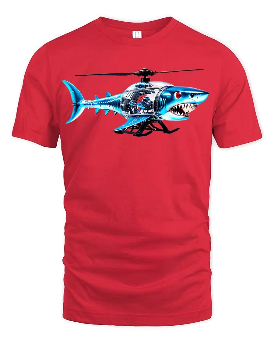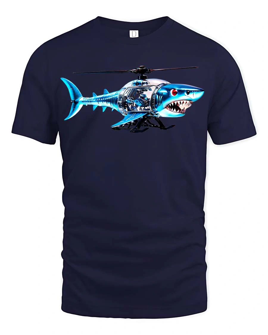 The detailed artwork showcases a mechanical shark fused with a helicopter body, creating a unique and playful concept that stands out in any crowd.