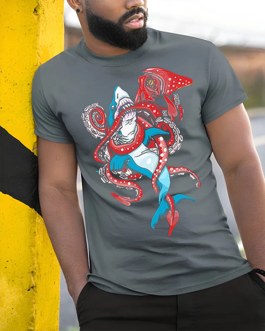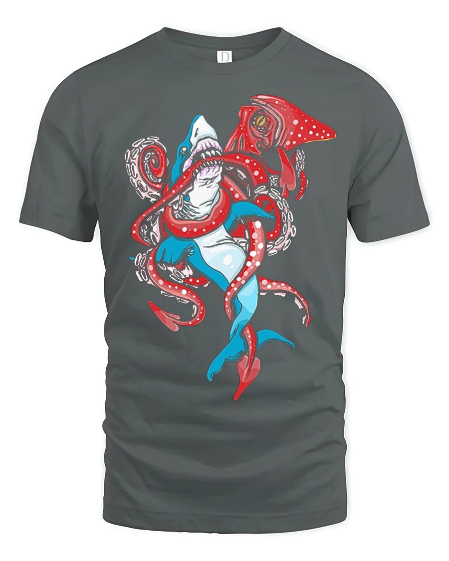 Shark Vs Squid Battle Graphic Tee With Bold Ocean Creature Art brings the intensity of the deep sea to life with a dynamic and action packed illustration. A powerful shark clashes with a giant squid, their movements intertwined in a fierce underwater struggle. The vivid colors, flowing tentacles, and striking details create a dramatic and energetic design that stands out from every angle. Crafted with soft material and high quality printing, this tee ensures comfort while showcasing the artwork with crisp clarity.