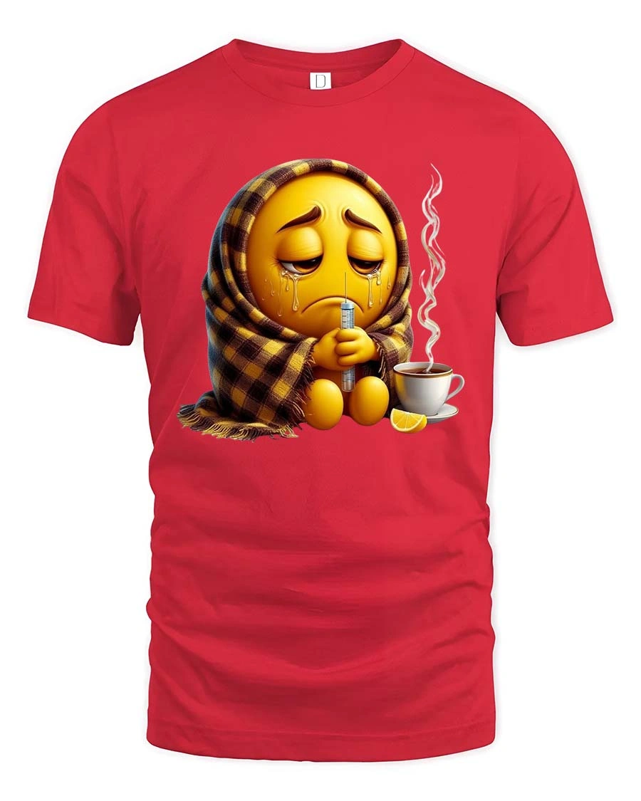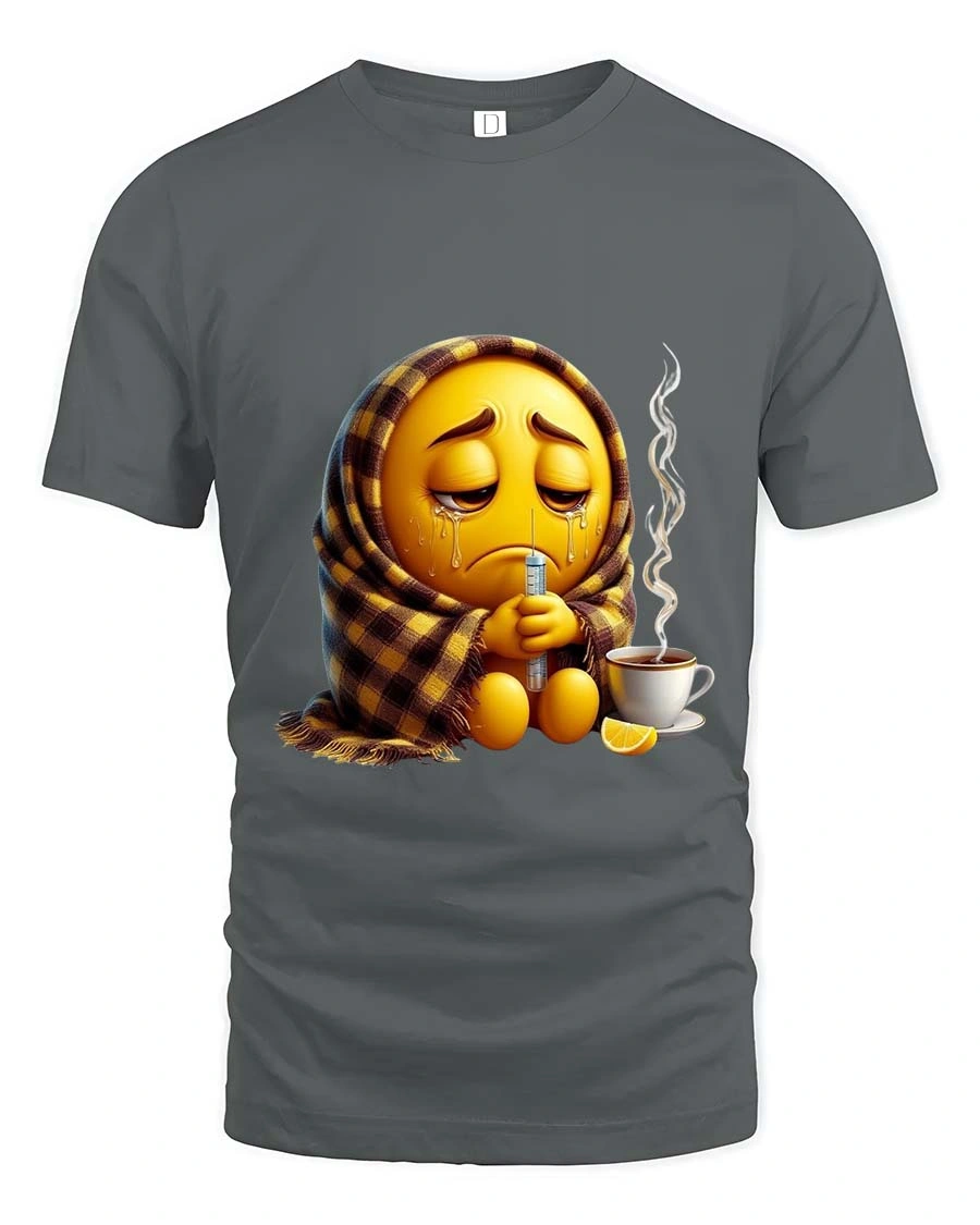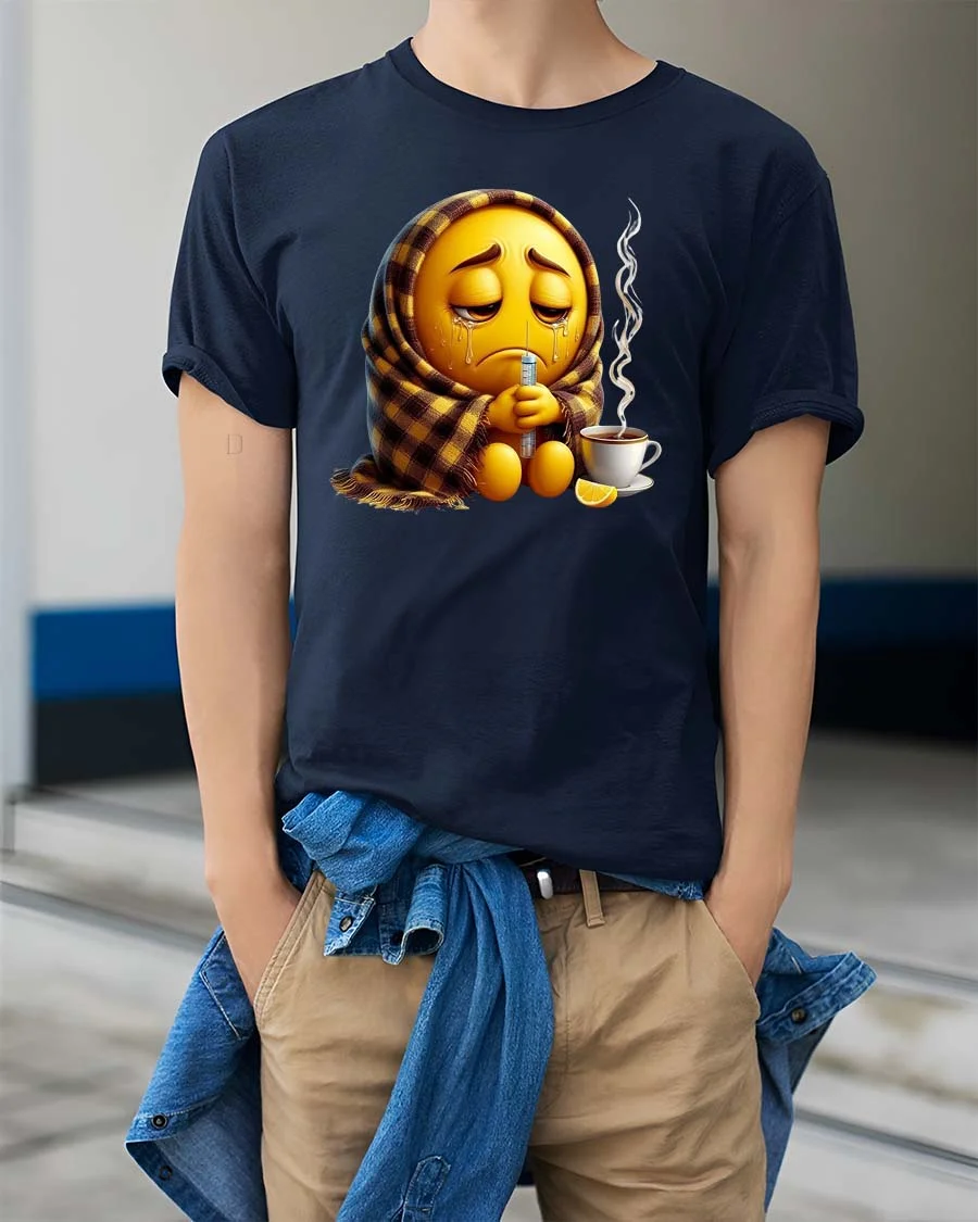 The Sick Emoji Wrapped In Blanket Funny Graphic T Shirt features a relatable and humorous design showing a sad emoji bundled up in a cozy blanket while holding a thermometer. With a steaming cup of tea and a slice of lemon nearby, the artwork perfectly captures the classic “sick day” moment many people know all too well.