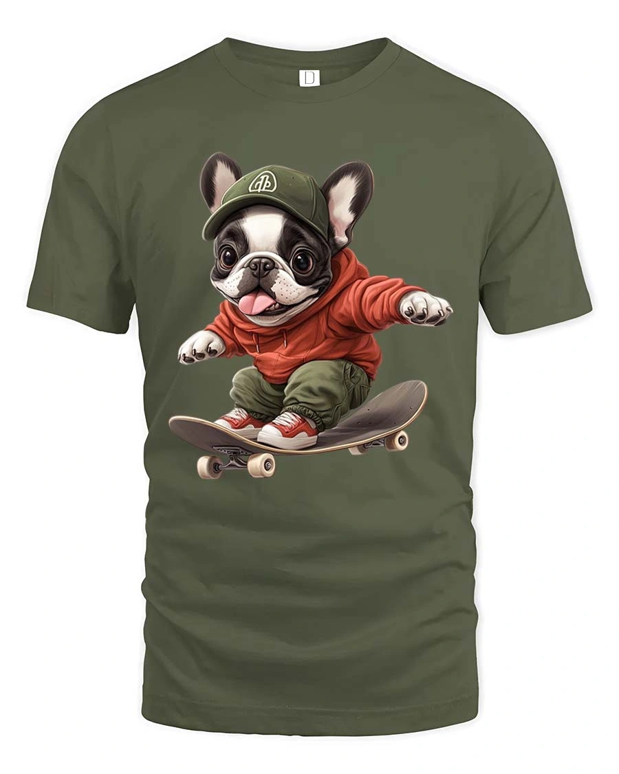 Skateboarding French Bulldog T-Shirt Cute Street Style Tee - military green t-shirt on white background