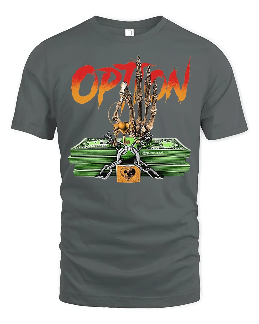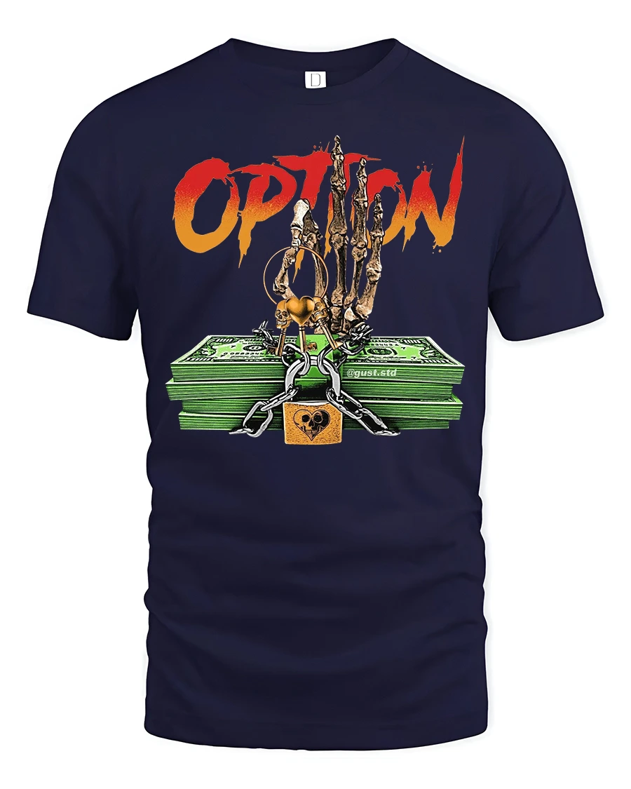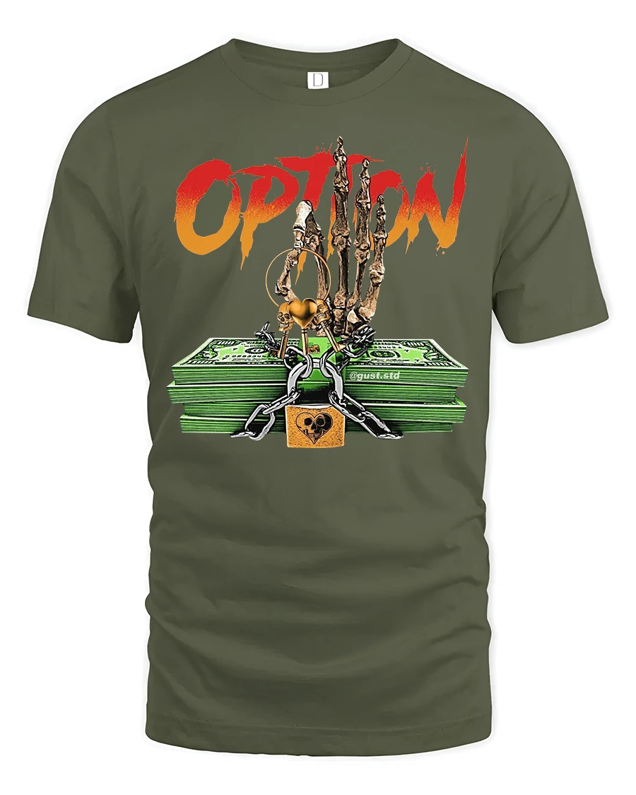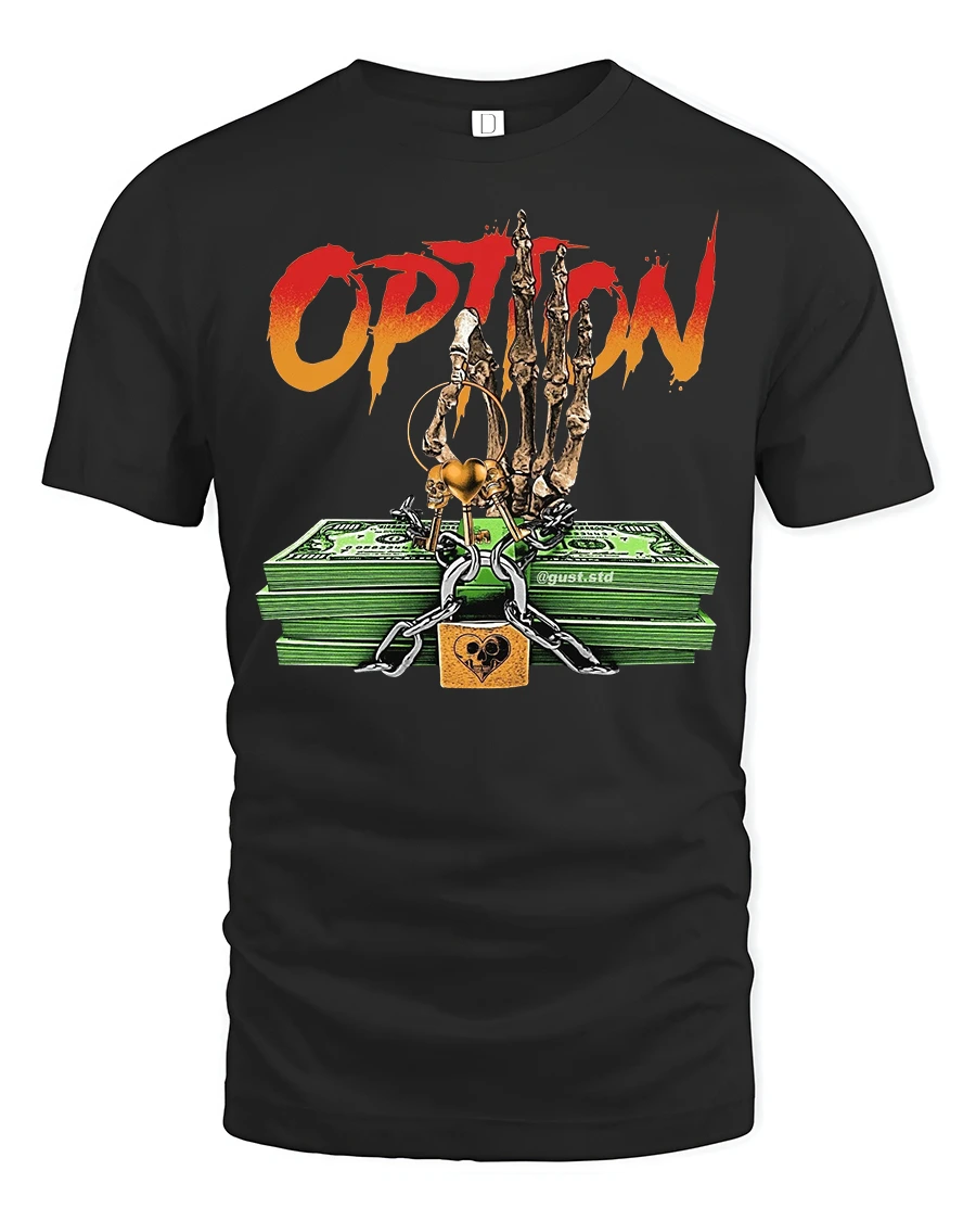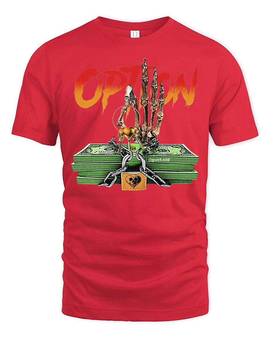 Stand out in bold style with the Skeleton Hand Money Stack Graphic Printed T-Shirt. This unique design features a skeleton hand rising above stacks of cash locked in chains, delivering a powerful message of money, choice, and edgy streetwear attitude. The fiery “OPTION” lettering adds an extra layer of impact, making this tee perfect for those who want to express individuality and bold taste.