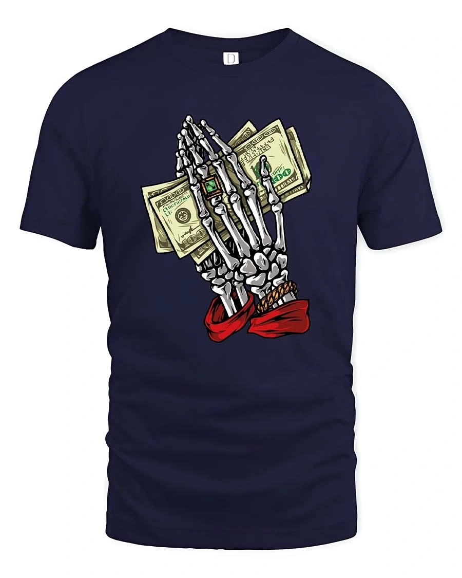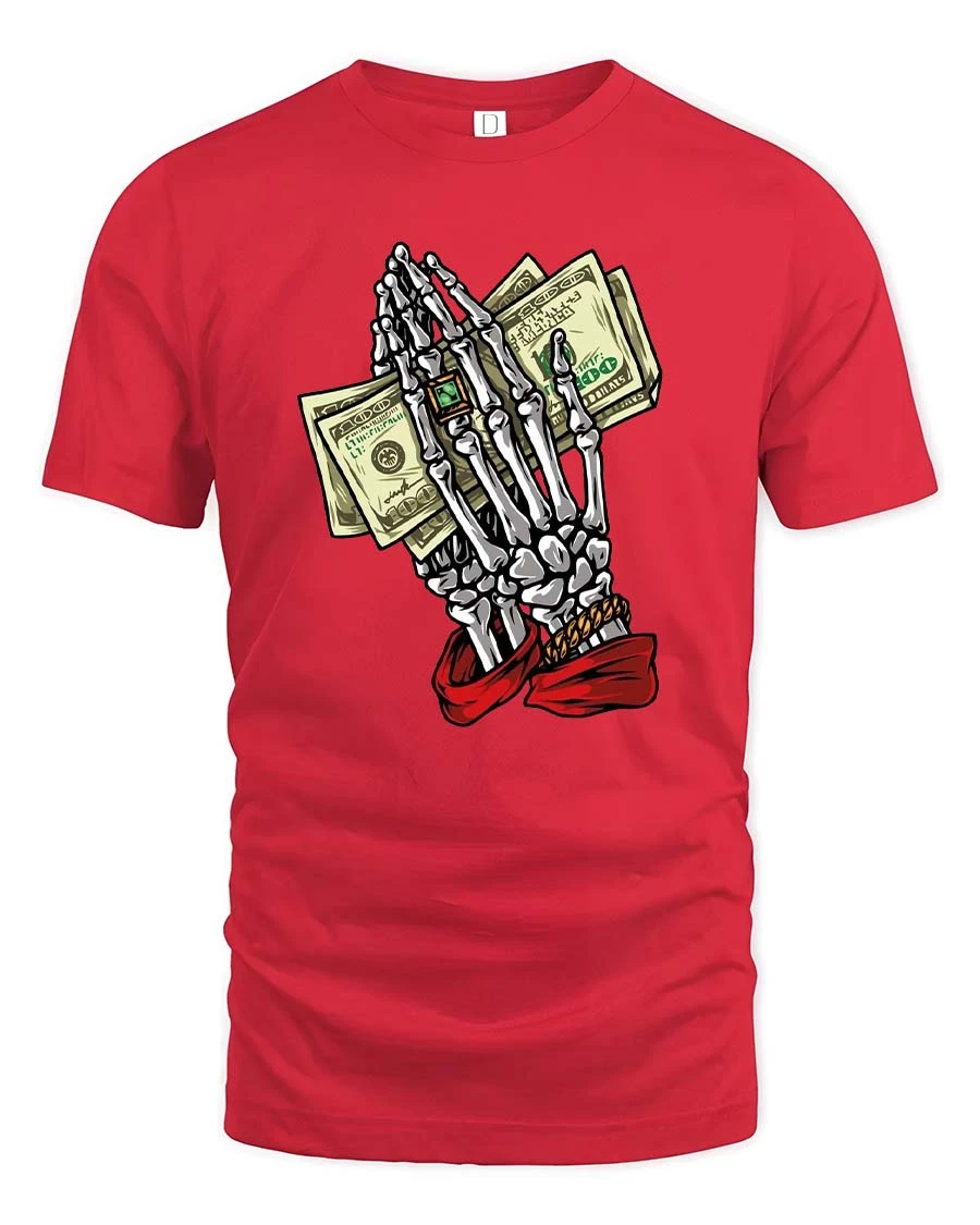 The Skeleton Hands Money Prayer Graphic T Shirt Street Hustle Art features a bold design that blends edgy street culture with striking visual symbolism.