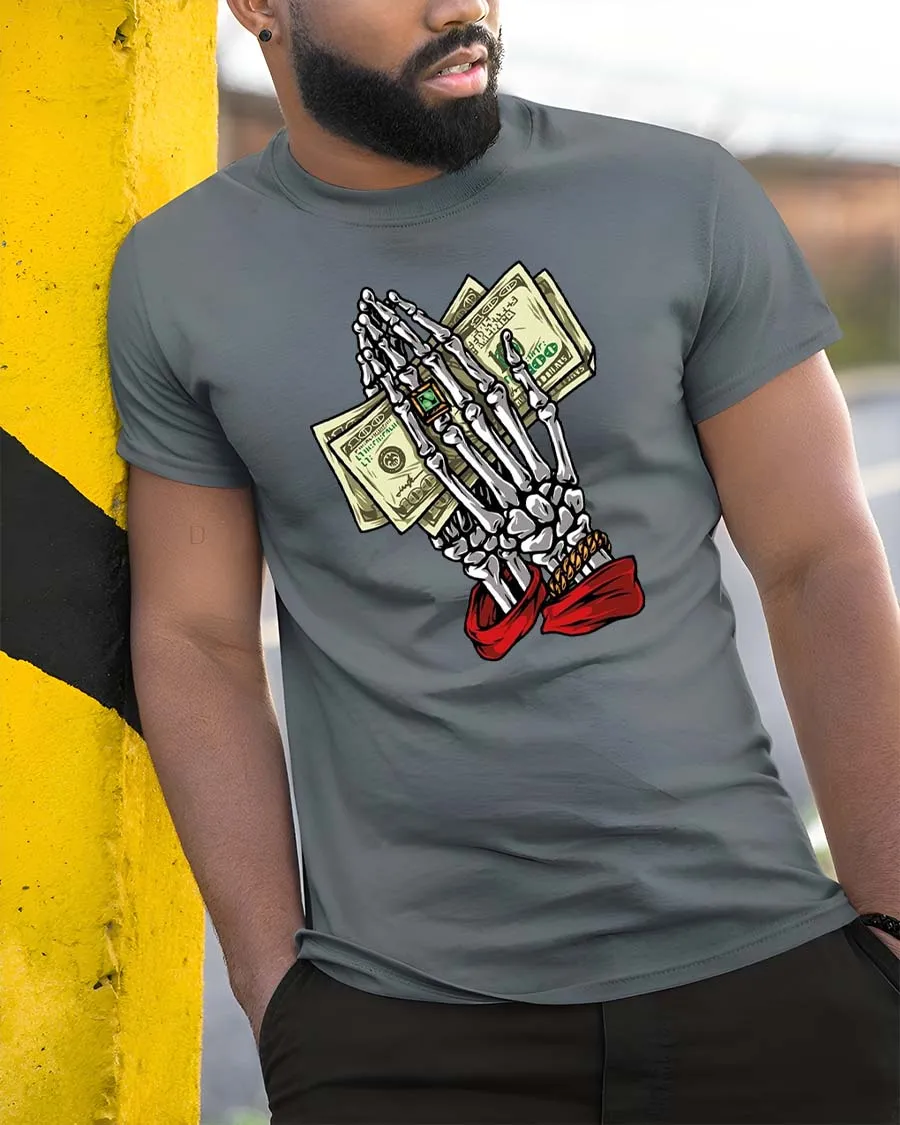 The Skeleton Hands Money Prayer Graphic T Shirt Street Hustle Art combines bold design, edgy symbolism, and creative street fashion energy.
