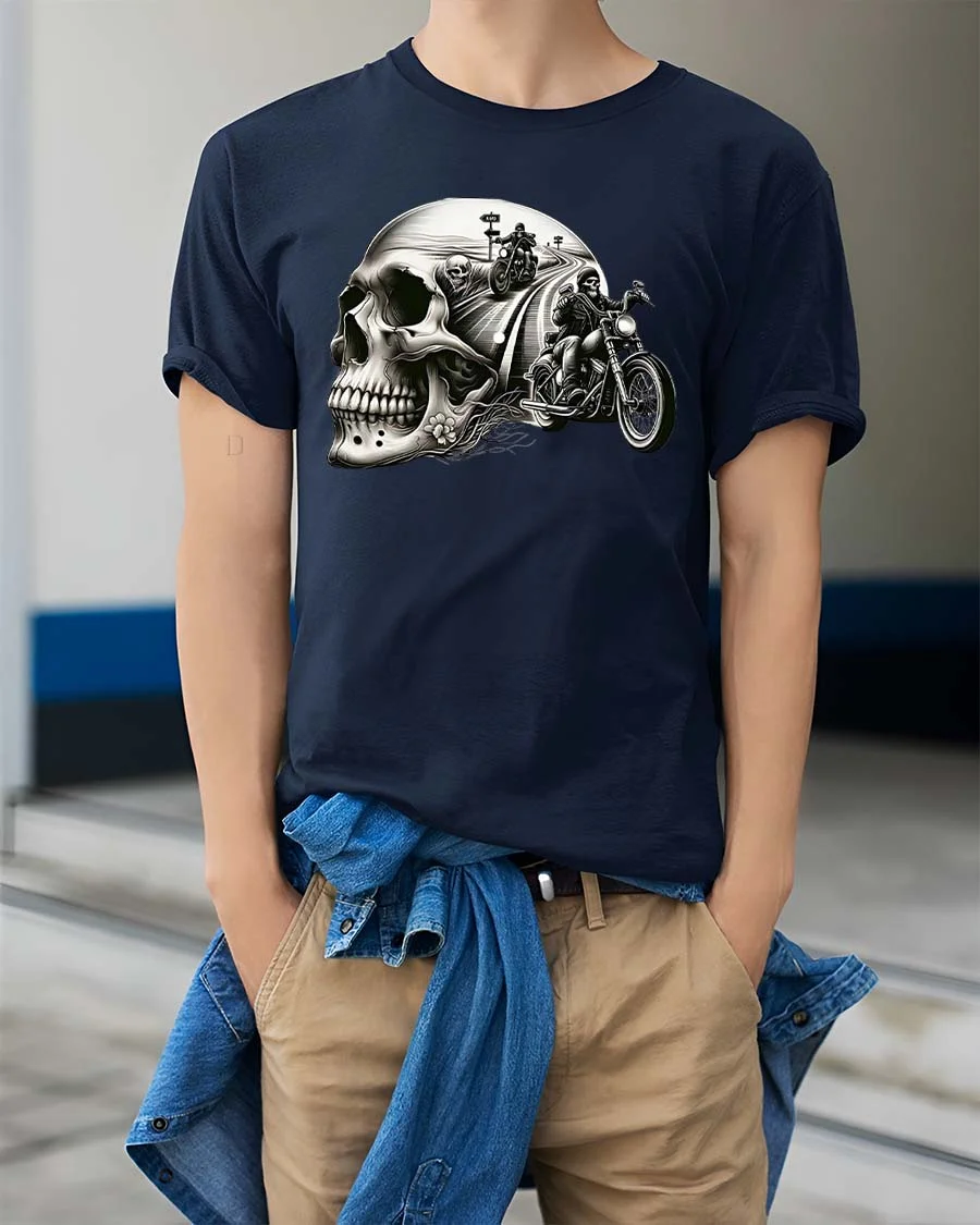 Featuring a detailed skull blended with a biker riding through a winding highway, this artwork delivers a powerful visual that stands out with attitude and style.
