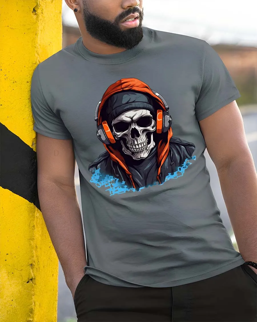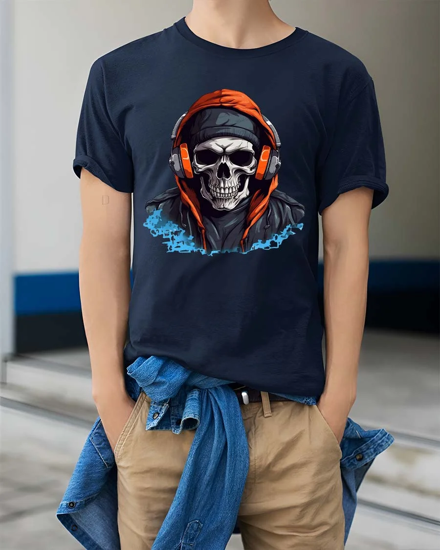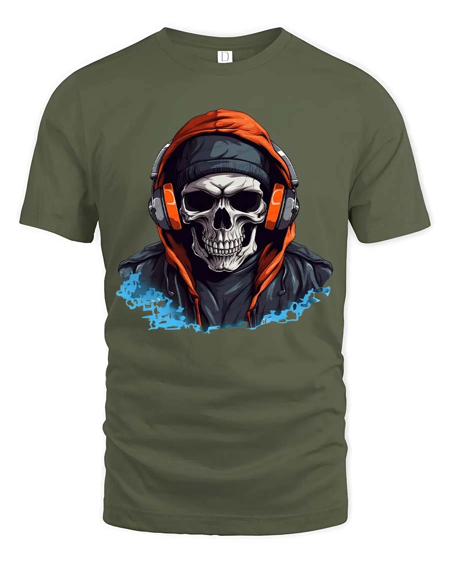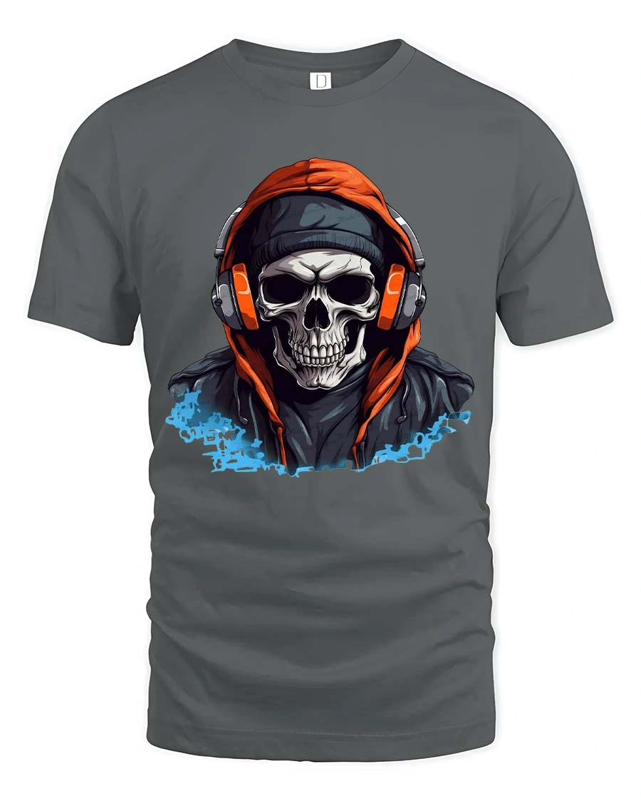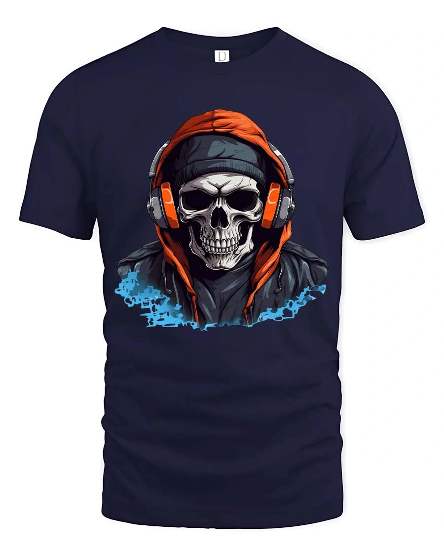 Featuring a detailed skull wearing headphones and a hoodie, this graphic creates a powerful urban vibe that stands out instantly.
