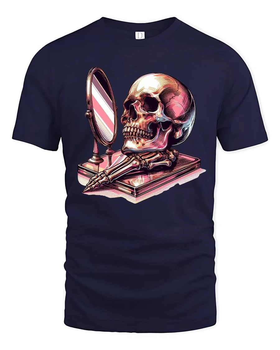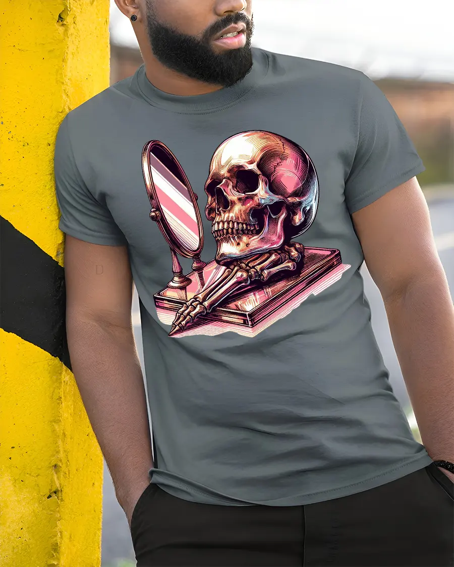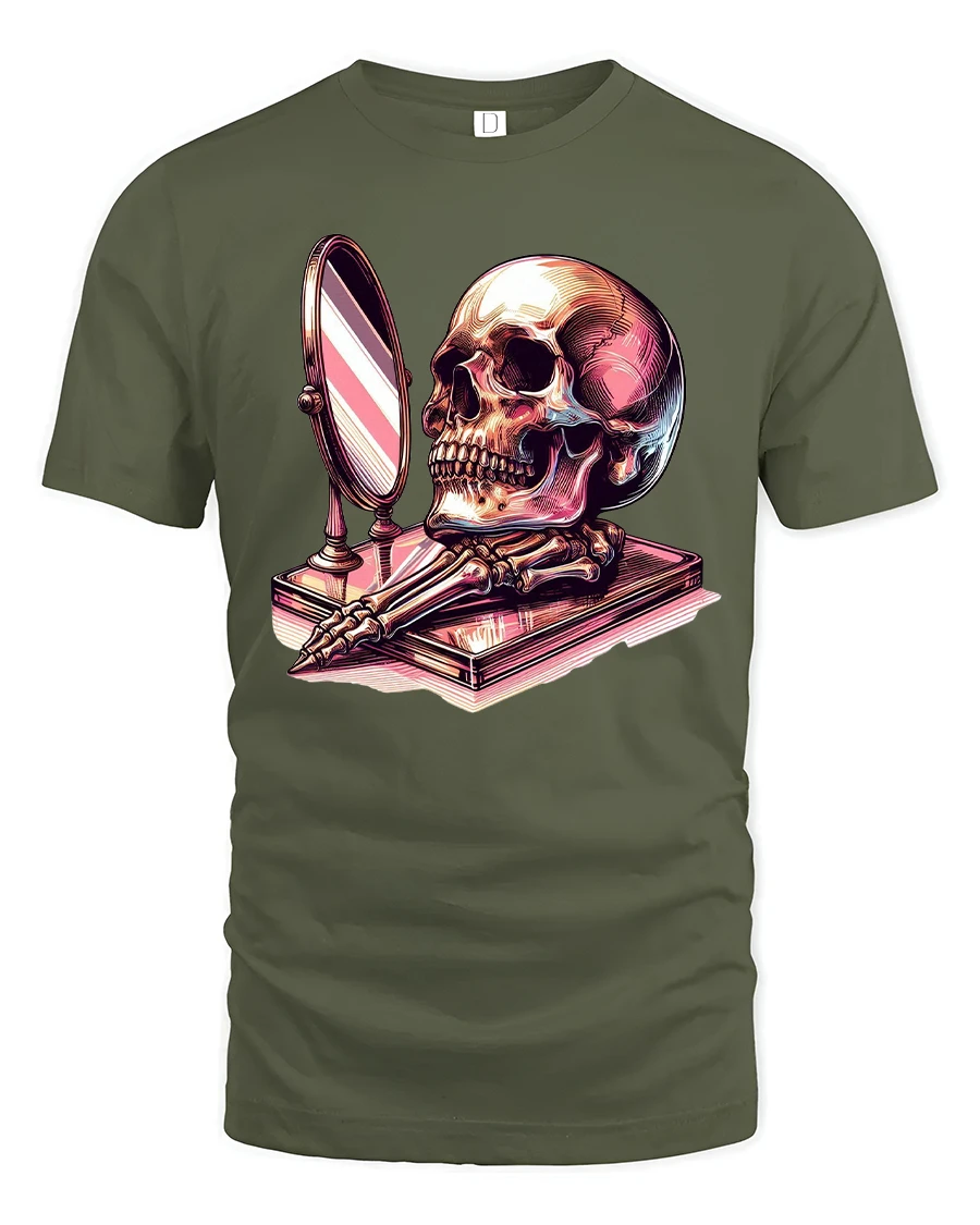 The Skull Mirror Reflection Gothic Art Graphic Tshirt is ideal for those who appreciate symbolism dark art and thoughtful design.