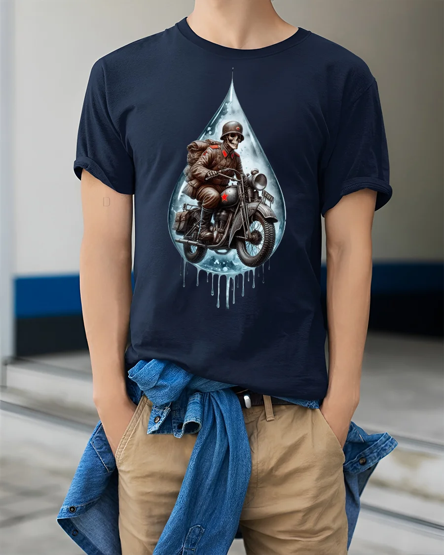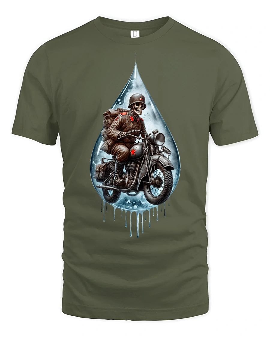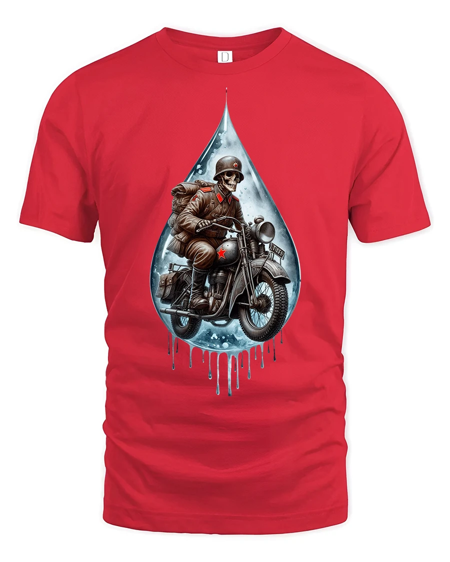Ride into the dark side of style with the Skull Soldier Rider Motorcycle Graphic T-Shirt, a bold design that blends gothic art with vintage biker vibes. This eye-catching print features a skeleton soldier riding a motorcycle, framed within a dripping water drop effect, making it the perfect tee for those who love edgy, fearless fashion.