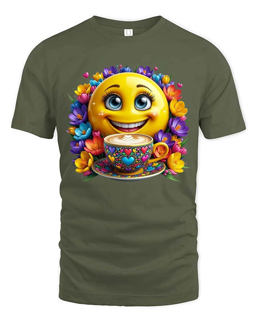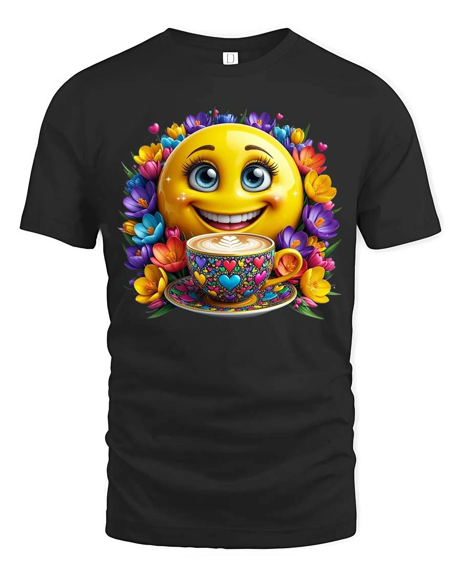 Featuring a bright smiling emoji paired with a beautifully detailed coffee cup and surrounded by vibrant flowers, this graphic tshirt blends positivity with artistic charm.