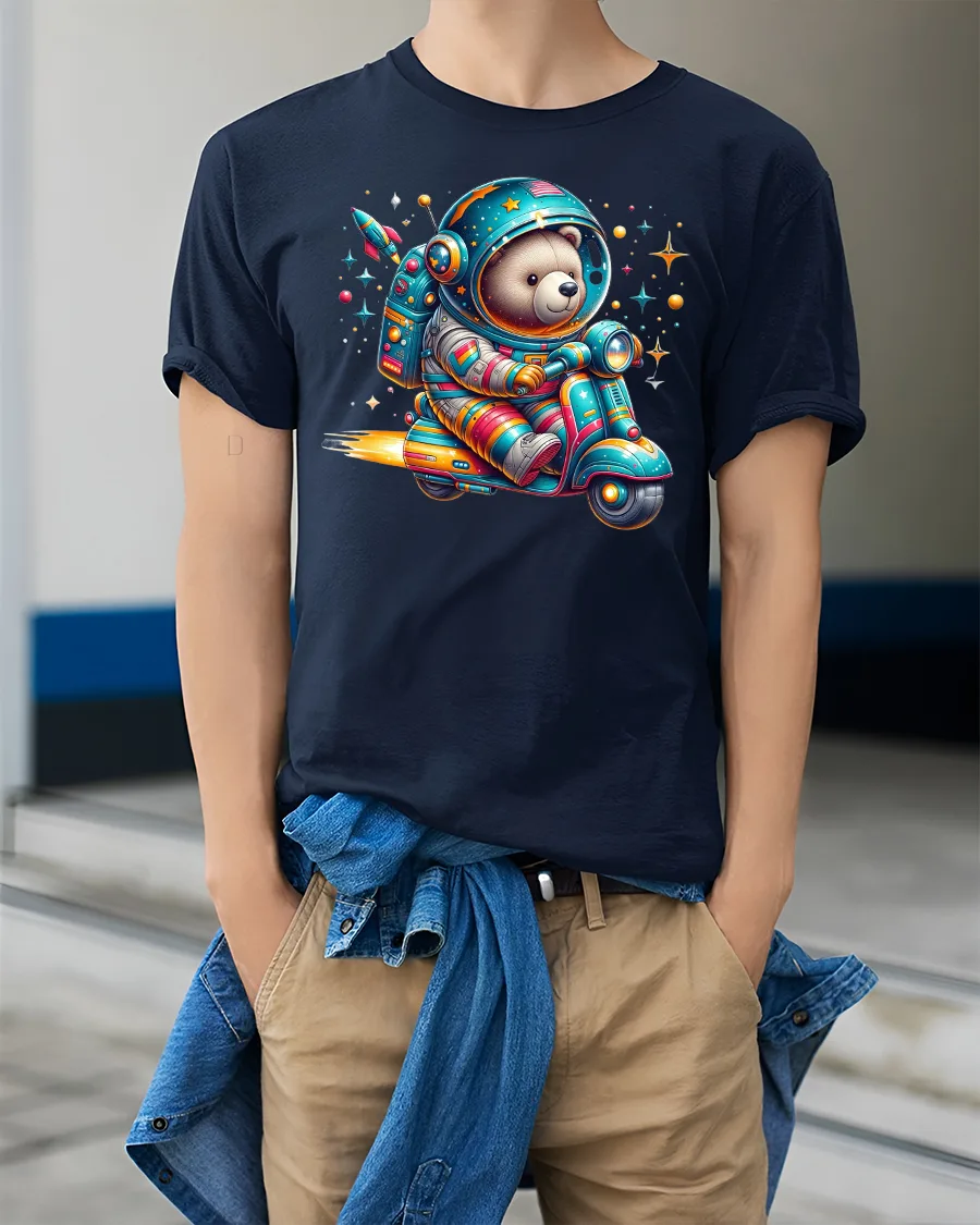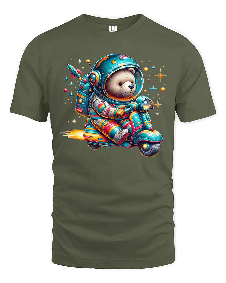 This Space Explorer Bear Riding Scooter Tee with Cute Cosmic Art brings a burst of color, charm, and imagination to your wardrobe. Featuring an adorable bear dressed in a detailed astronaut suit, the design shows him zipping through the stars on a rocket-powered scooter, surrounded by planets, sparkles, and vibrant cosmic colors. The artwork blends playful fantasy with futuristic style, making the tee stand out instantly.