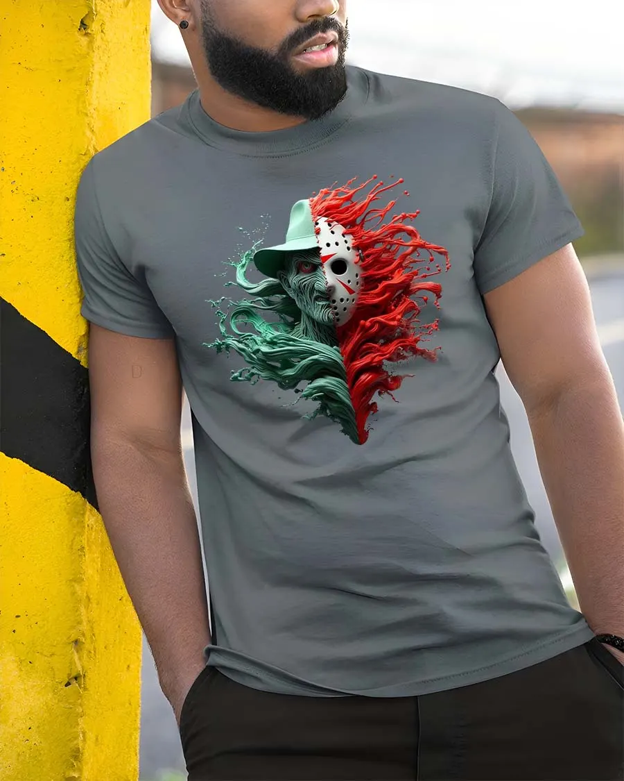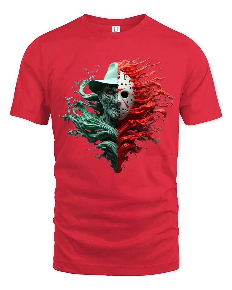 Split Horror Mask Character Graphic T Shirt Dual Face Scary Tee features a striking design that blends two terrifying personalities into one powerful visual.