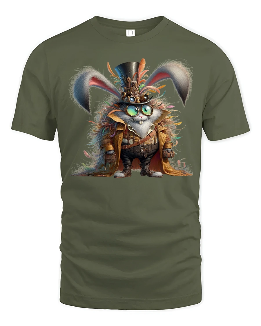 This Steampunk Bunny Adventurer Tee with Fantasy Gear Art brings together imagination, creativity, and vintage mechanical charm in one striking design. Featuring a highly detailed bunny dressed in goggles, boots, layered belts, and a feathered top hat, this tee offers a bold mix of whimsical fantasy and classic steampunk style. Its vibrant colors and textured artwork make it perfect for fans of unique character designs and retro-inspired aesthetics.