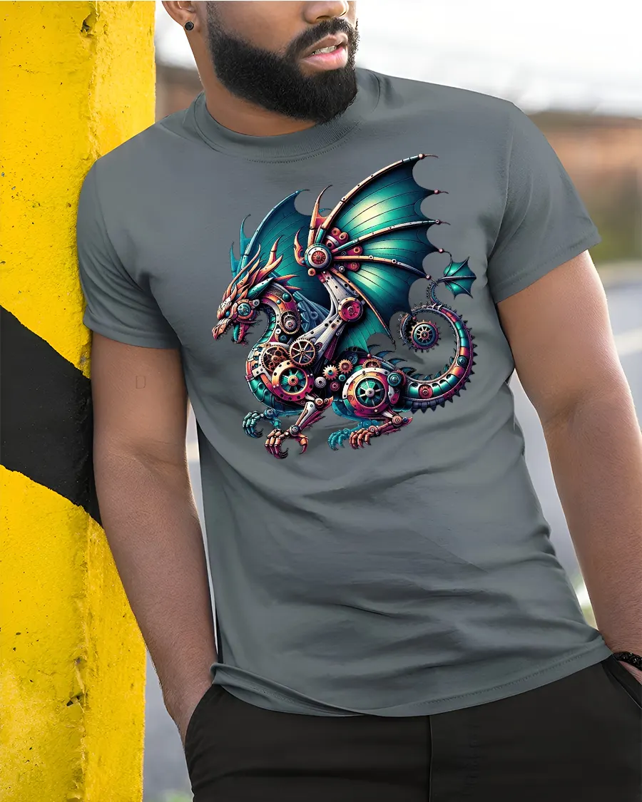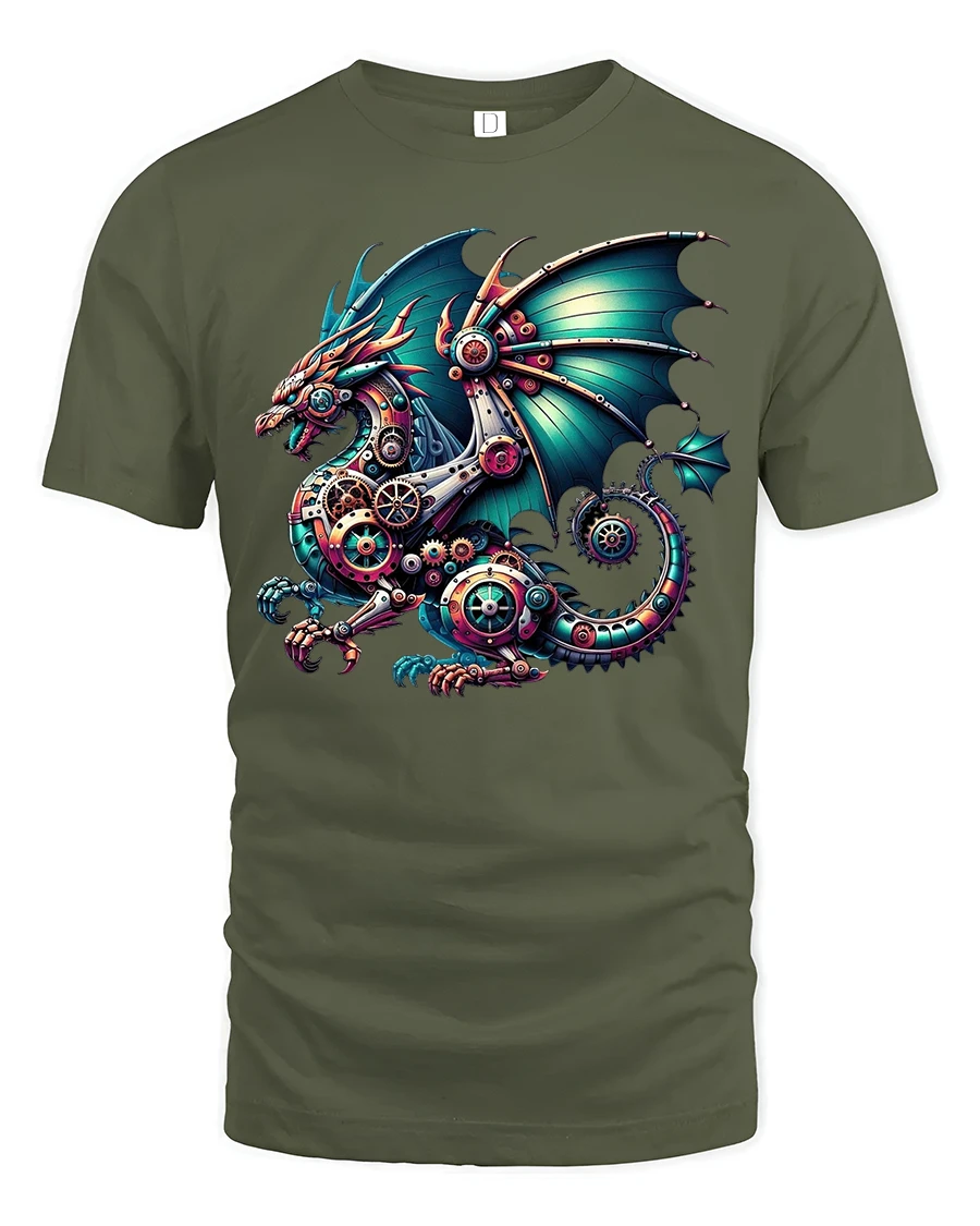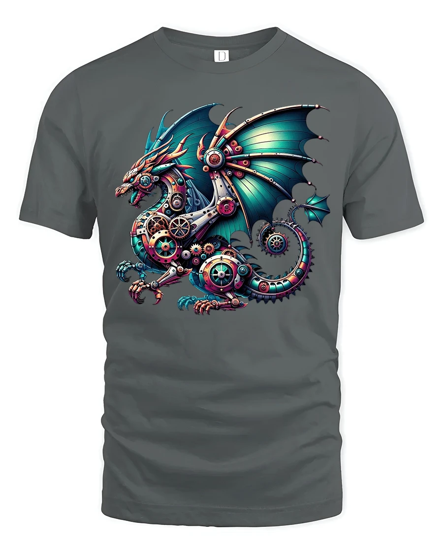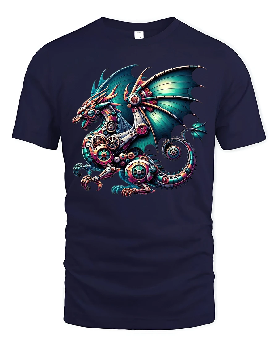 Featuring a powerful dragon built from gears, cogs, pipes, and metallic details, this design blends steampunk style with mechanical artistry. The vivid colors and intricate details make it perfect for dragon lovers, fantasy fans, cosplay enthusiasts, and anyone who enjoys unique and creative graphic tees.