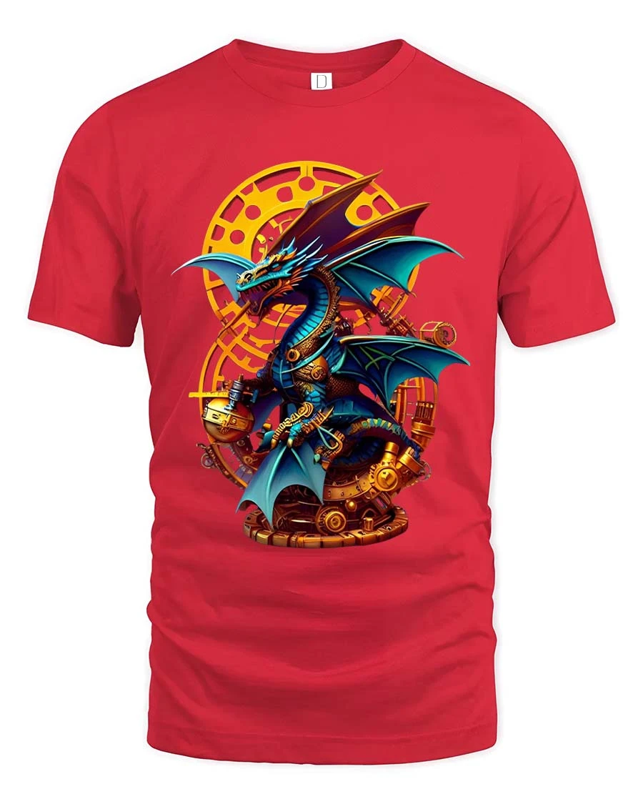 Steampunk Dragon T-Shirt Mechanical Fantasy Gear Art Tee - red t-shirt on white background