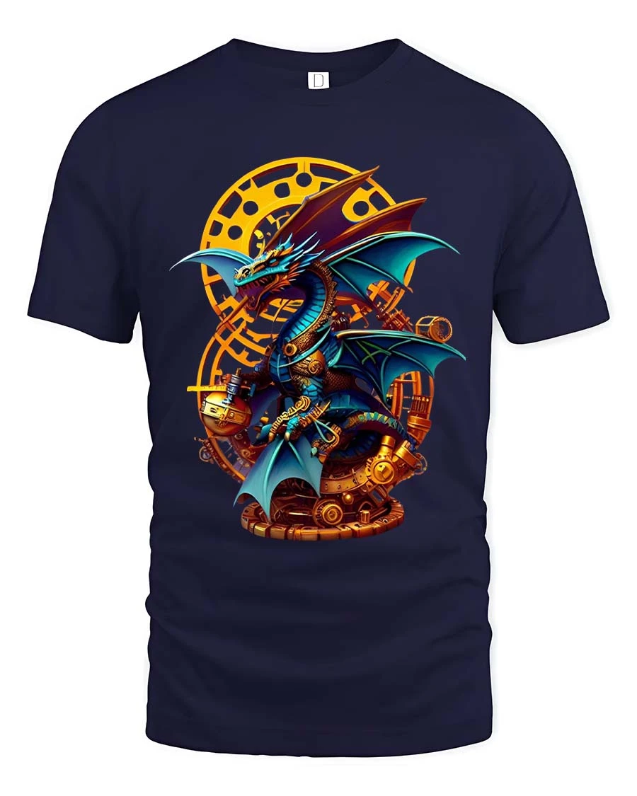 Steampunk Dragon T-Shirt Mechanical Fantasy Gear Art Tee - navy t-shirt on white background