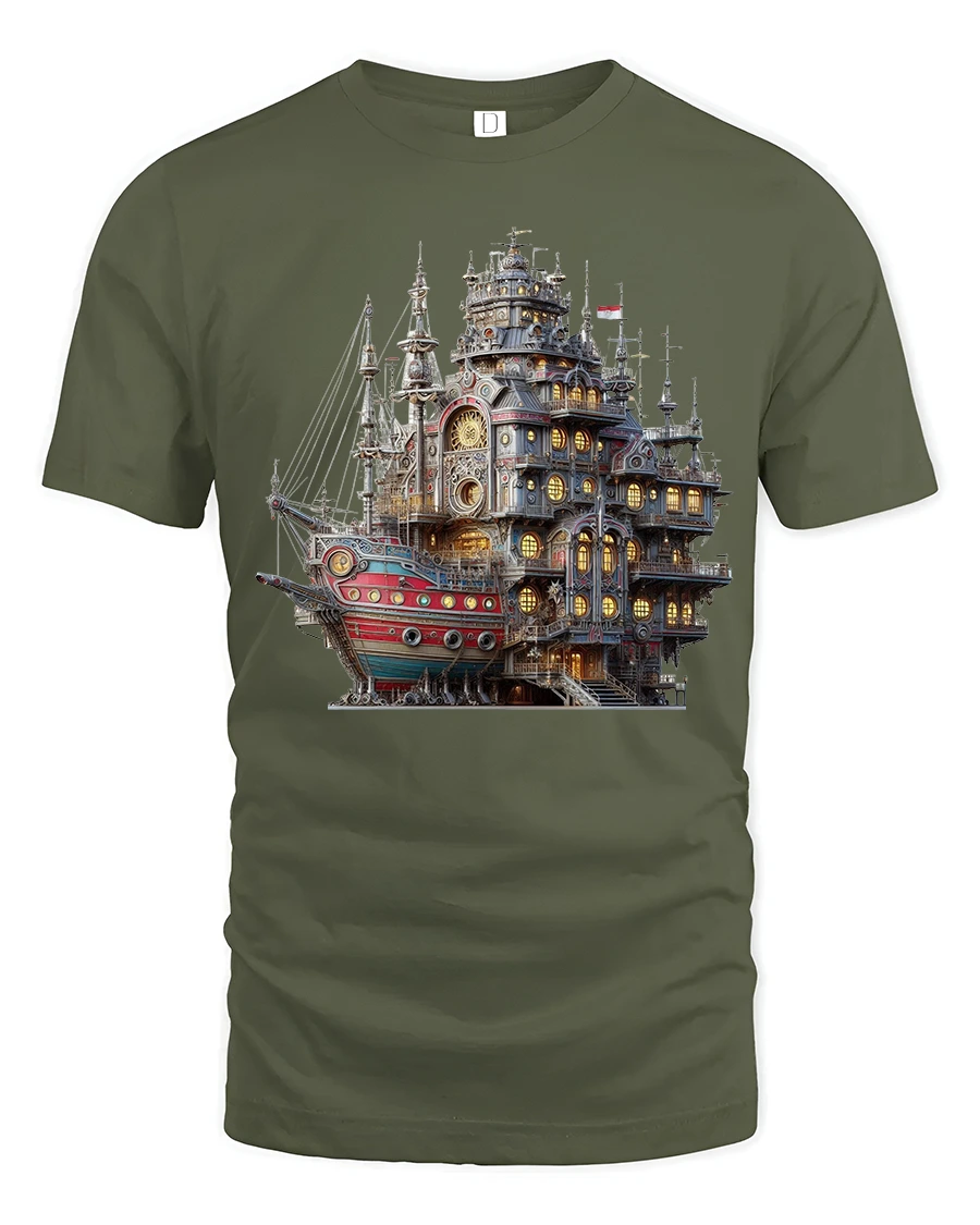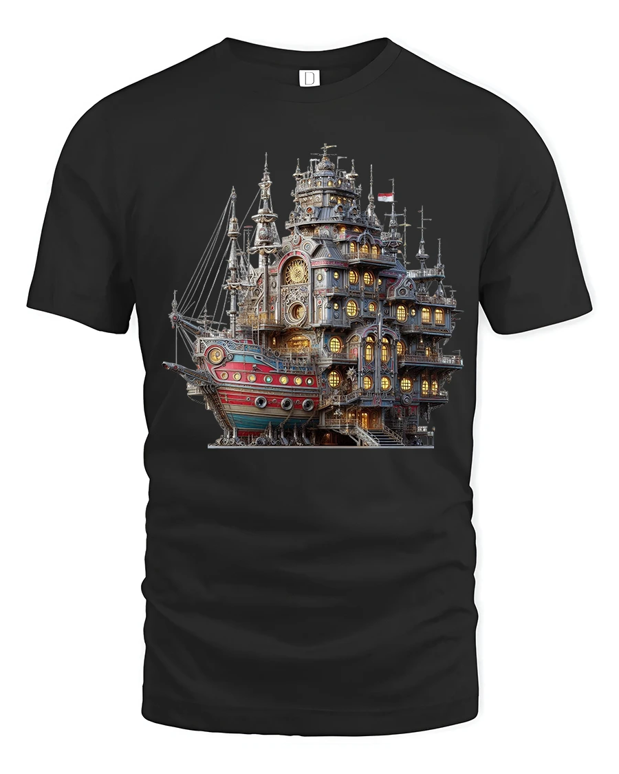 The Steampunk Fantasy Ship Castle Adventure Art Graphic T Shirt showcases an extraordinary blend of imagination creativity and intricate design.
