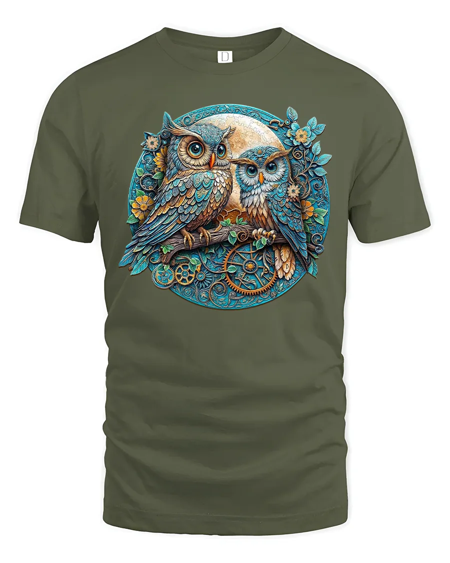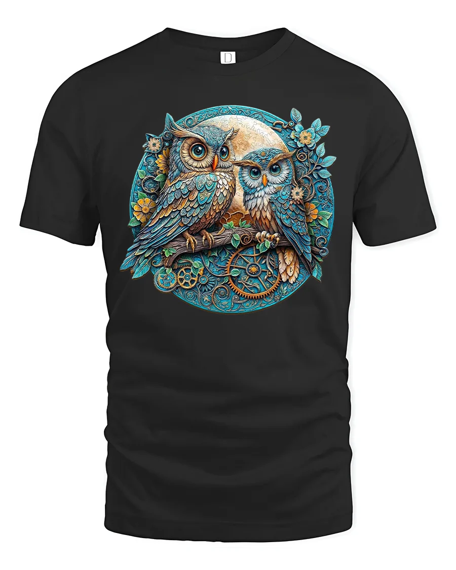 Steampunk Owls Art Tee with Vintage Moon & Gears Illustration brings together the perfect blend of fantasy, retro style, and detailed artistry, making it an ideal choice for owl lovers and steampunk enthusiasts. The intricate design features two beautifully rendered owls perched above ornate gears, floral engravings, and a glowing full moon backdrop, creating a mesmerizing visual effect that captures attention instantly.