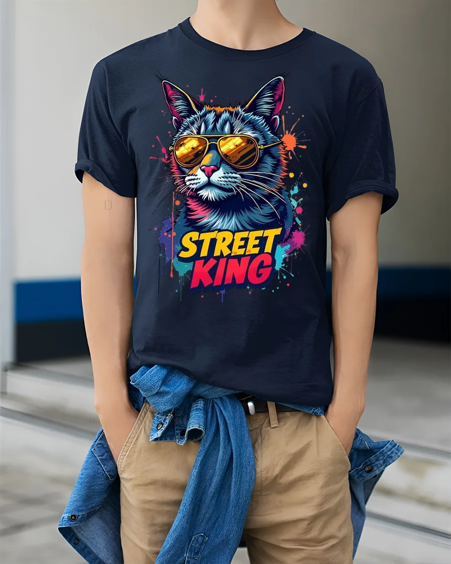 Make a bold statement with the Street King Cat Graphic Tee with Cool Sunglasses. This eye-catching shirt features a stylish cat rocking golden shades, surrounded by vibrant graffiti-style splashes for the ultimate streetwear vibe. It’s the perfect mix of humor, fashion, and edgy design that instantly sets you apart.