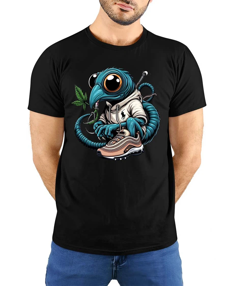 Featuring a unique alien bug character rocking a hoodie and sneakers, this design blends futuristic imagination with urban style for a truly standout look.