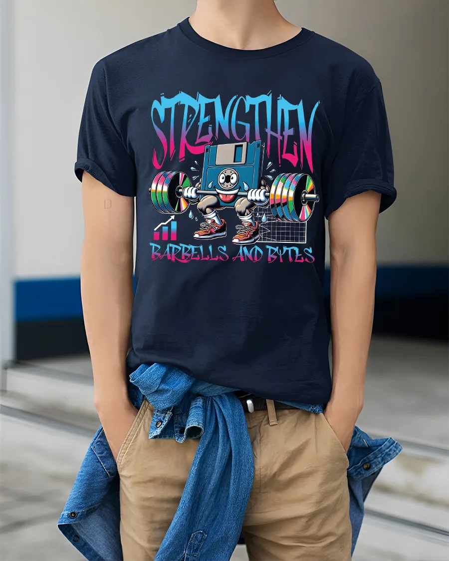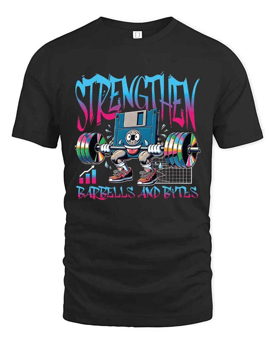 Strengthen Barbells And Bytes Funny Tech Gym T Shirt combines fitness passion with geek culture in one bold and colorful design. Featuring a retro style computer character lifting heavy barbells, this creative graphic celebrates both physical strength and digital power. The vibrant Strengthen lettering and playful artwork make it a standout piece that blends gym motivation with tech humor.