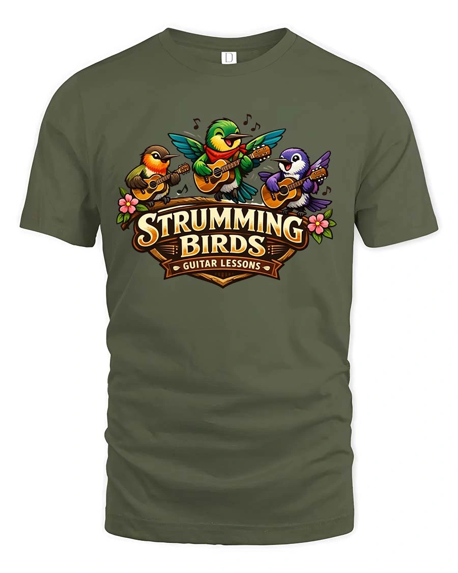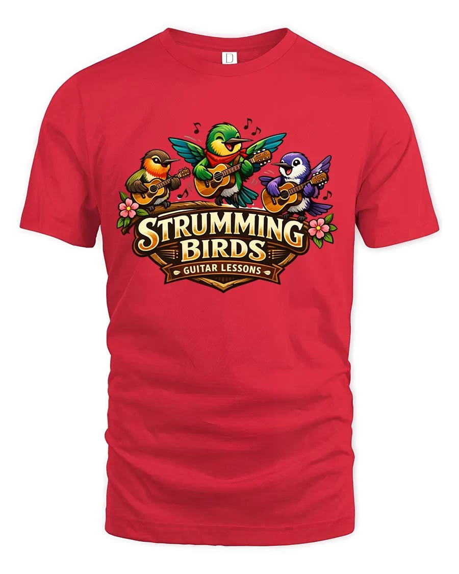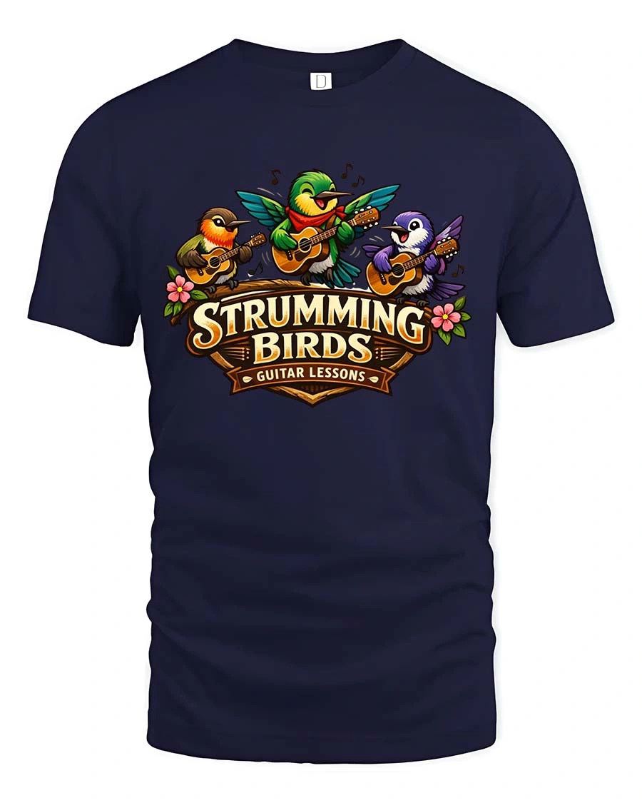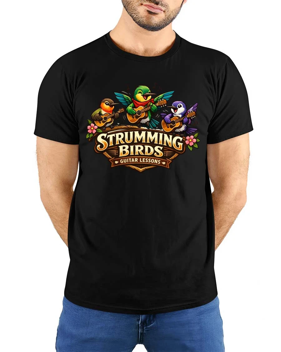 Strumming Birds Guitar Music Cute Cartoon Graphic Tshirt brings a cheerful and musical vibe to your everyday style.
