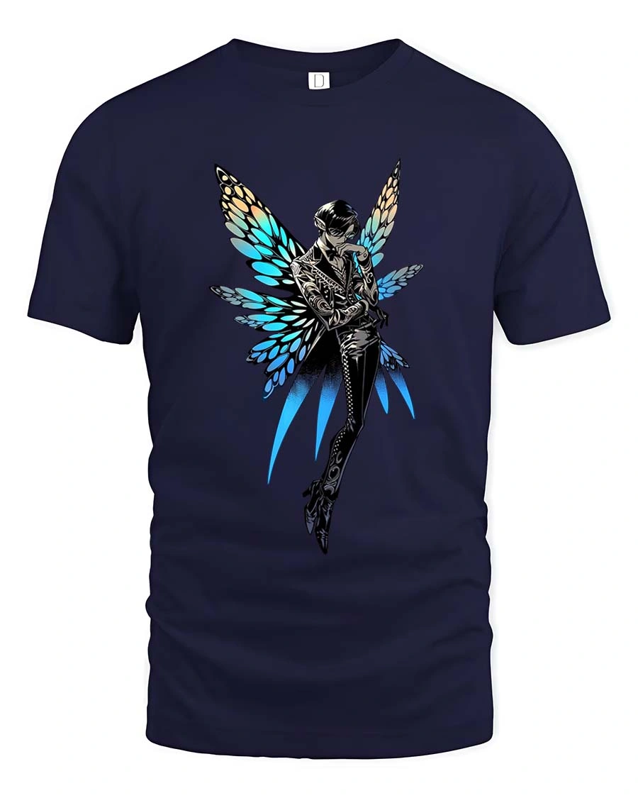 Stylish Fairy With Butterfly Wings T Shirt Dark Fantasy Graphic Tee - model wearing navy tee with hands in pockets