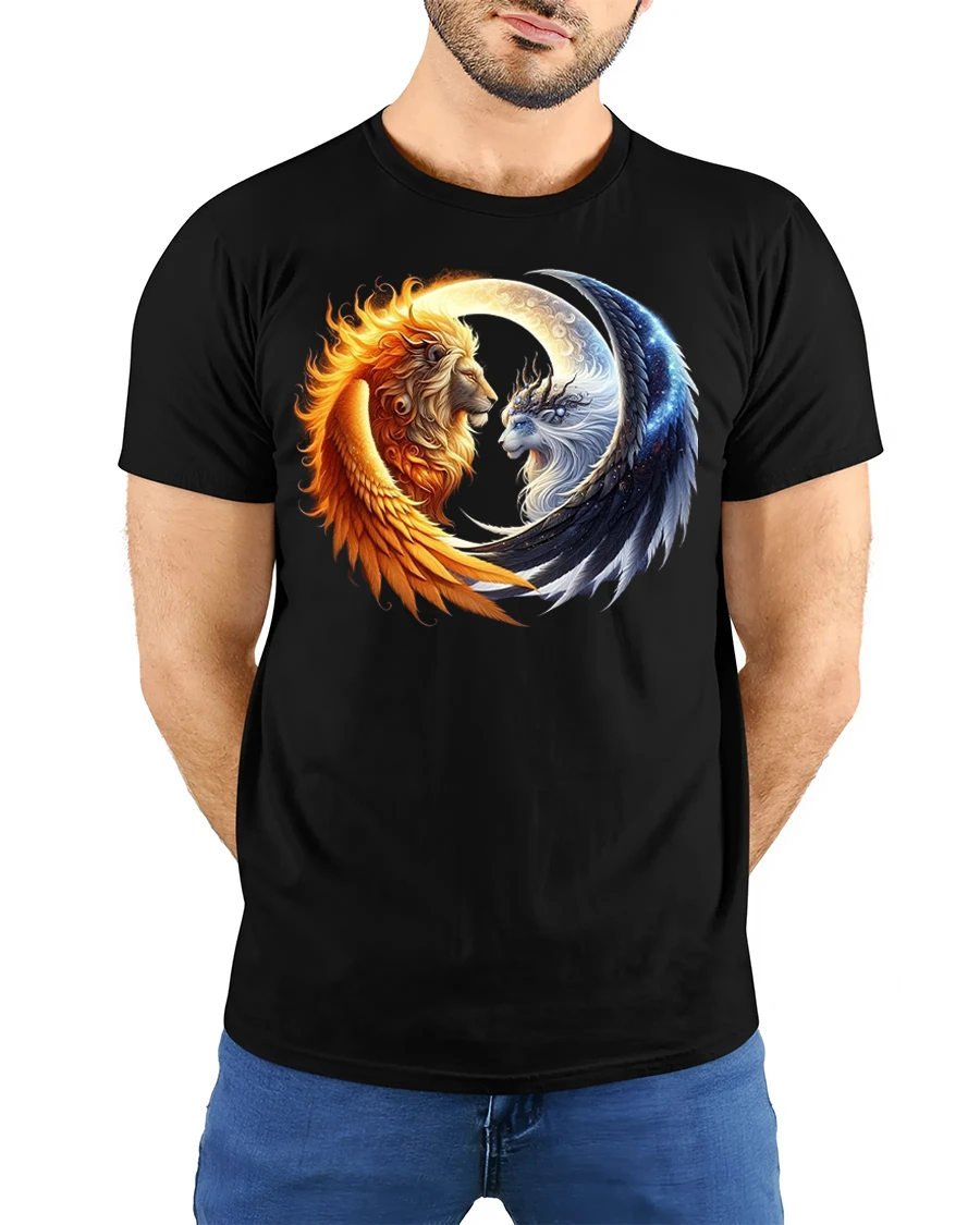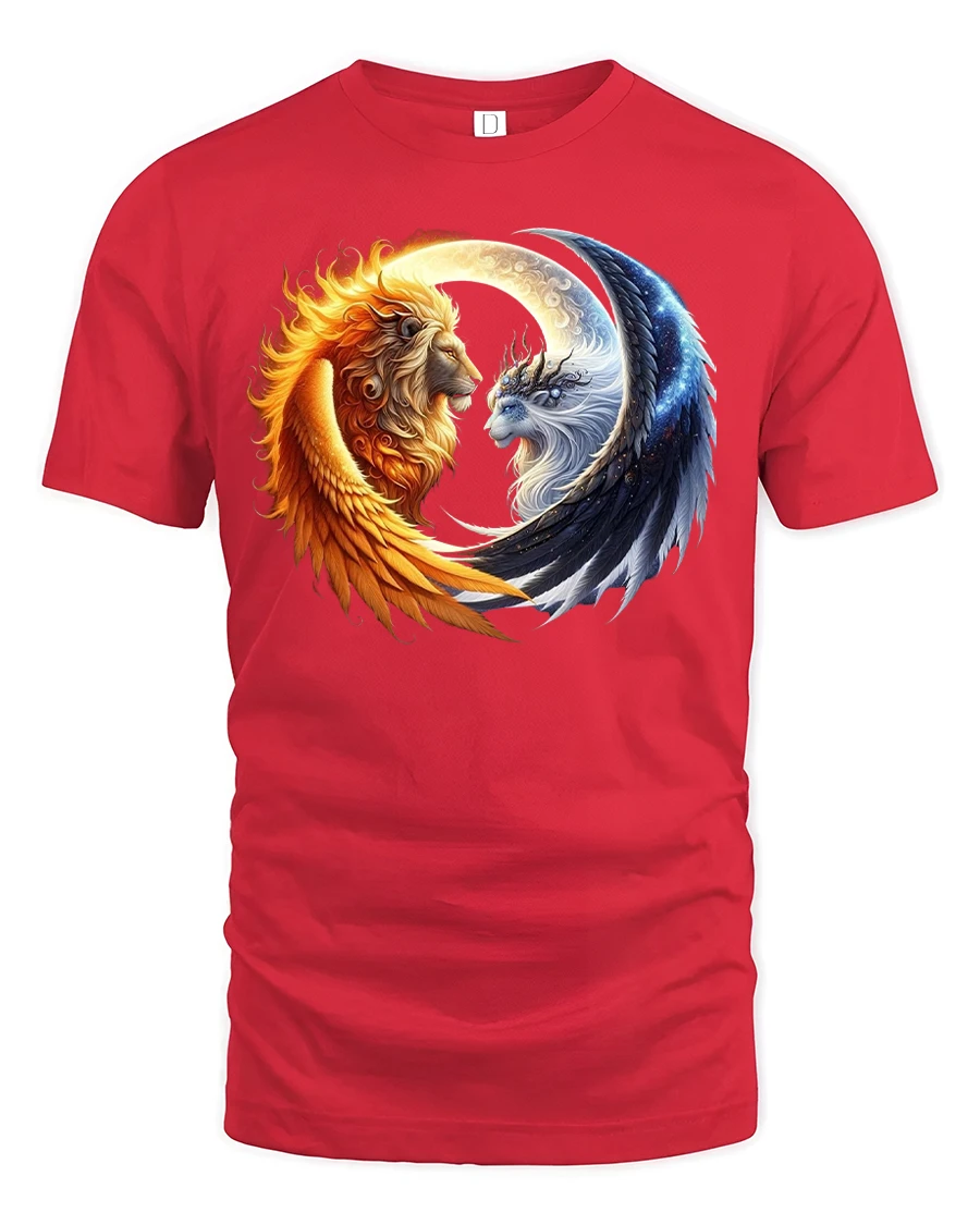 Tags: artistic lion print, astrology sun moon tee, balance energy tee, celestial lion shirt, cosmic art tee, dual lion shirt, fantasy lion shirt, fire and ice t-shirt, galaxy design tee, lion yin yang shirt, metaphysical t-shirt, mystical lion t-shirt, spirit animal t-shirt, spiritual harmony tee, sun and moon lion tee