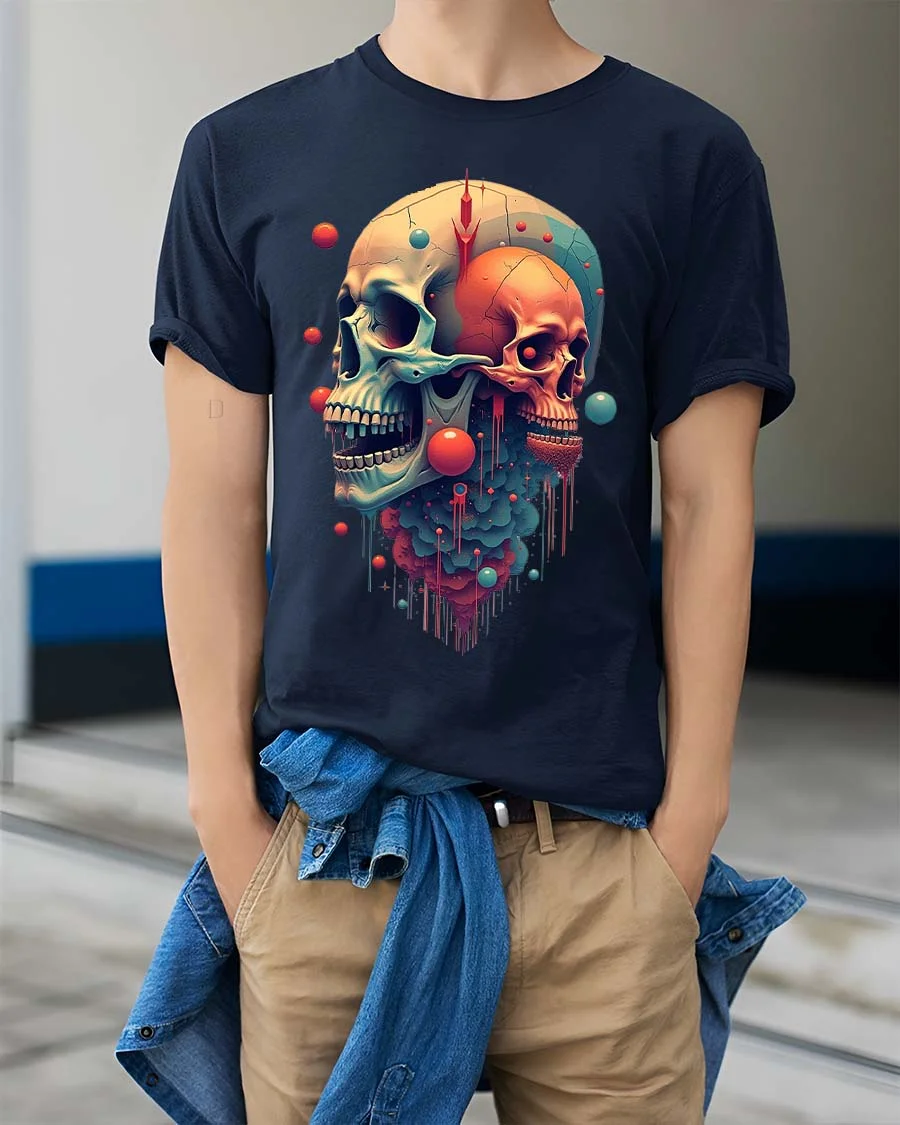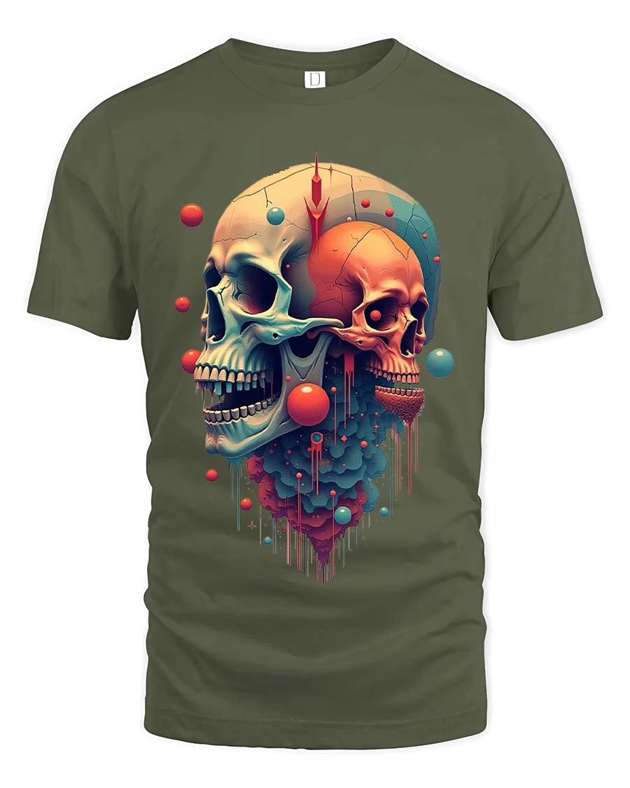 Surreal Dual Skull Abstract Art Graphic T Shirt delivers a bold and thought provoking design that blends dark aesthetics with vibrant artistic detail.