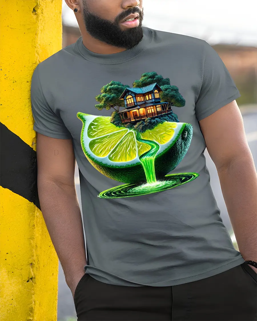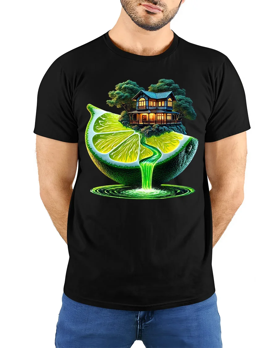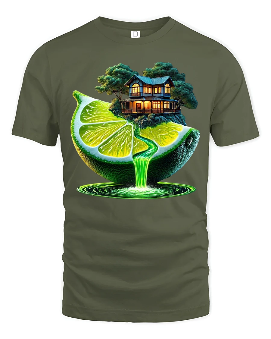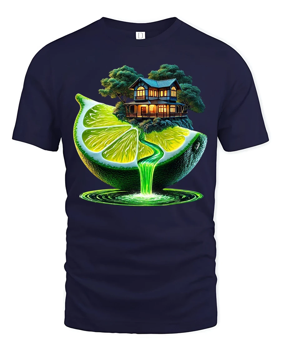 Surreal Lime Waterfall Fantasy House Art Tee blends nature, creativity, and dreamlike imagination into one stunning wearable artwork. Featuring a glowing lime slice pouring a neon waterfall beneath a cozy cottage perched on top, this tshirt captures a magical scene that feels straight out of a storybook. The vibrant green tones and surreal composition make it perfect for fans of fantasy art, nature lovers, and anyone who enjoys bold and imaginative designs.