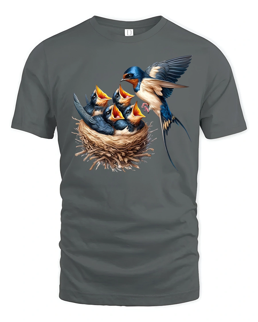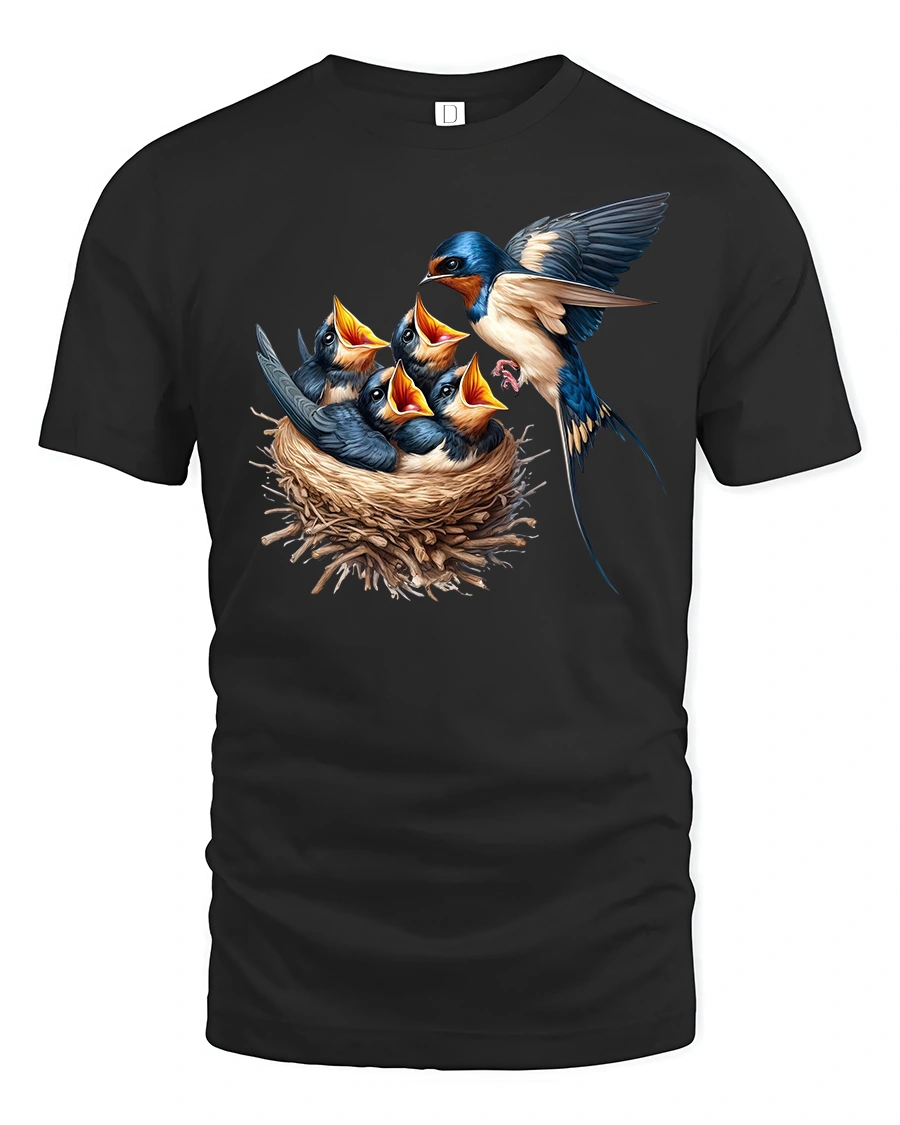 Celebrate the beauty of wildlife with the Swallow Bird Family Nest Graphic Nature Print T-Shirt, a stunning design that captures the heartwarming moment of a mother swallow feeding her chicks. This artwork brings nature to life with vivid details and rich colors, making it a must-have for bird lovers and outdoor enthusiasts.