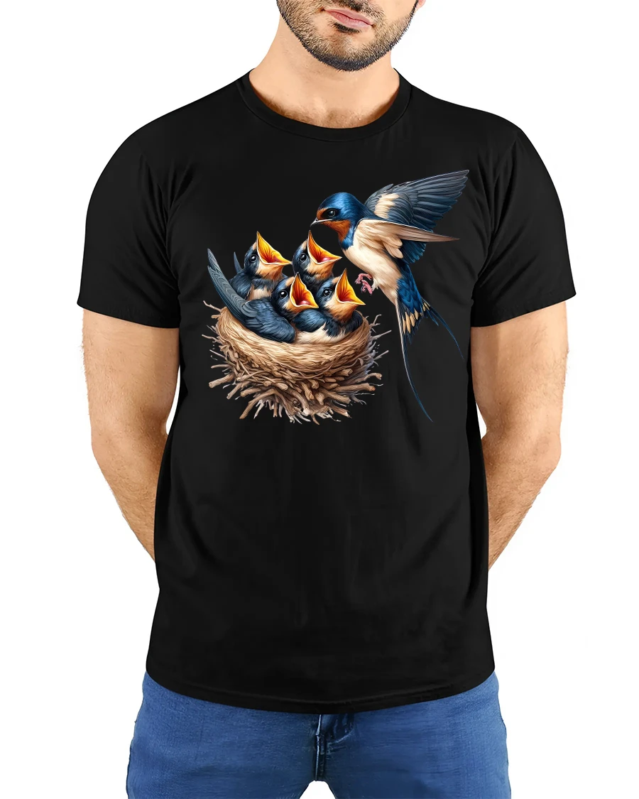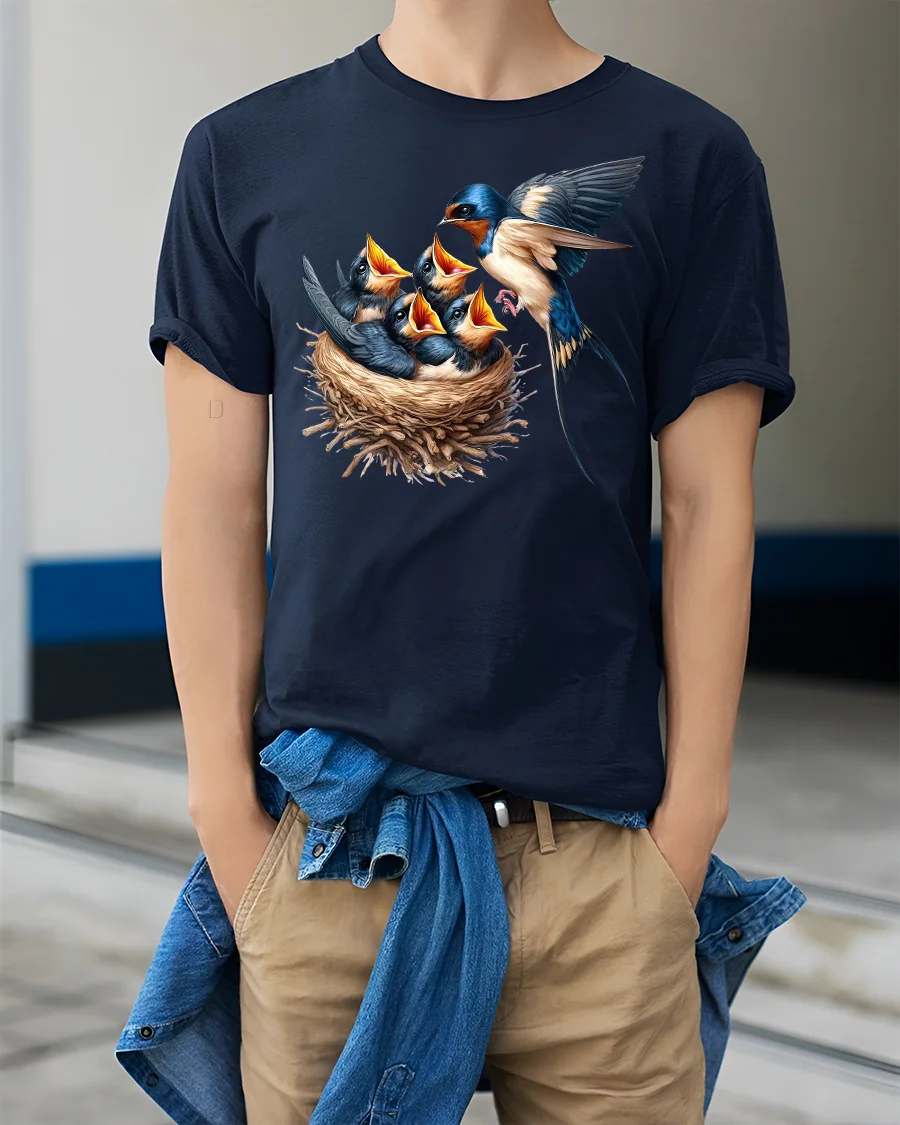 The Swallow Bird Family Nest Graphic Nature Print T-Shirt also makes a thoughtful gift for animal lovers and those who enjoy spending time in the great outdoors. Pair it with jeans, shorts, or casual wear for a look that’s as timeless as nature itself. Embrace the spirit of family, love, and freedom with this nature-inspired tee.
