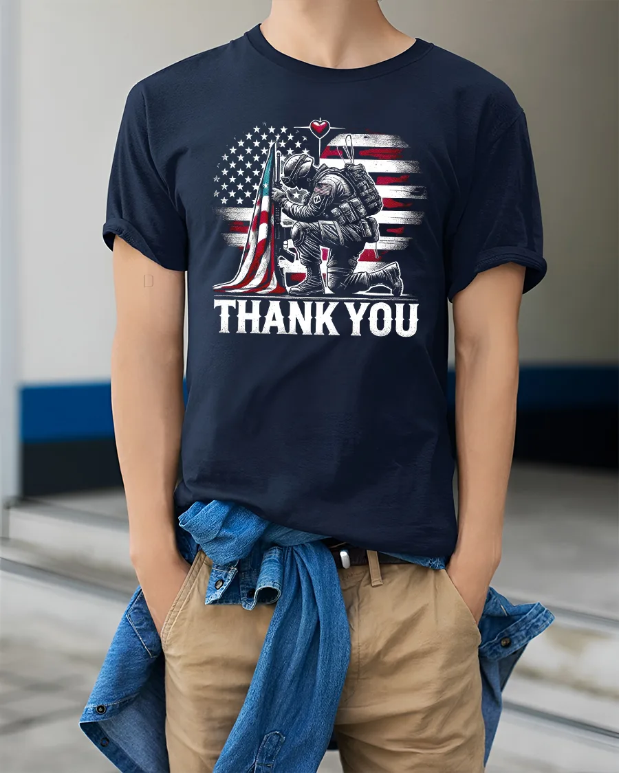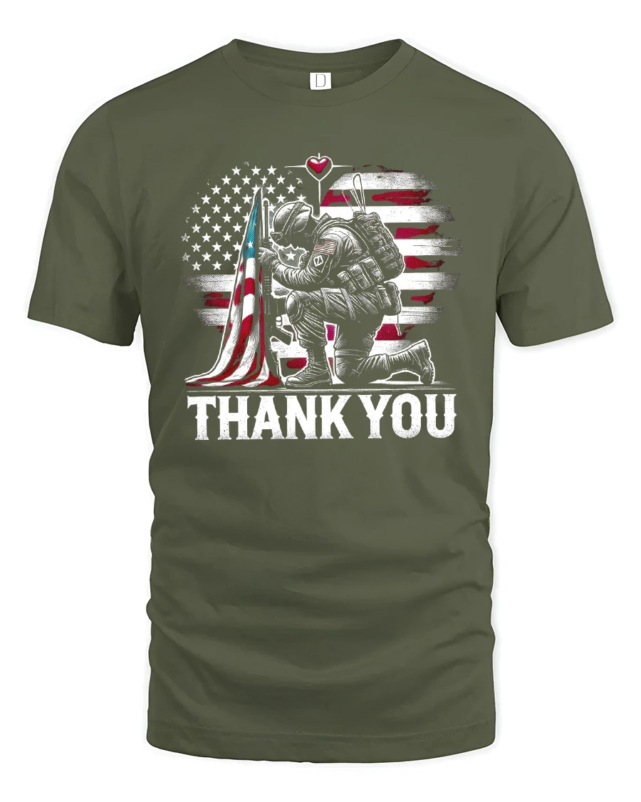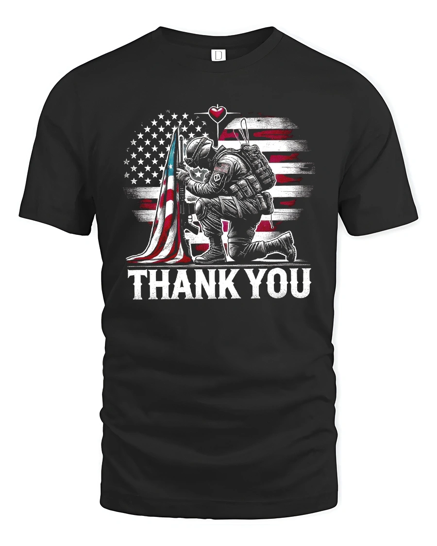 Show your pride and gratitude with the Thank You Soldier American Flag Military Graphic Tee. Featuring a powerful design of a soldier kneeling by the American flag, this shirt honors the bravery, sacrifice, and dedication of those who serve and protect our nation. The bold “THANK YOU” text makes this tee a statement of respect and patriotism.